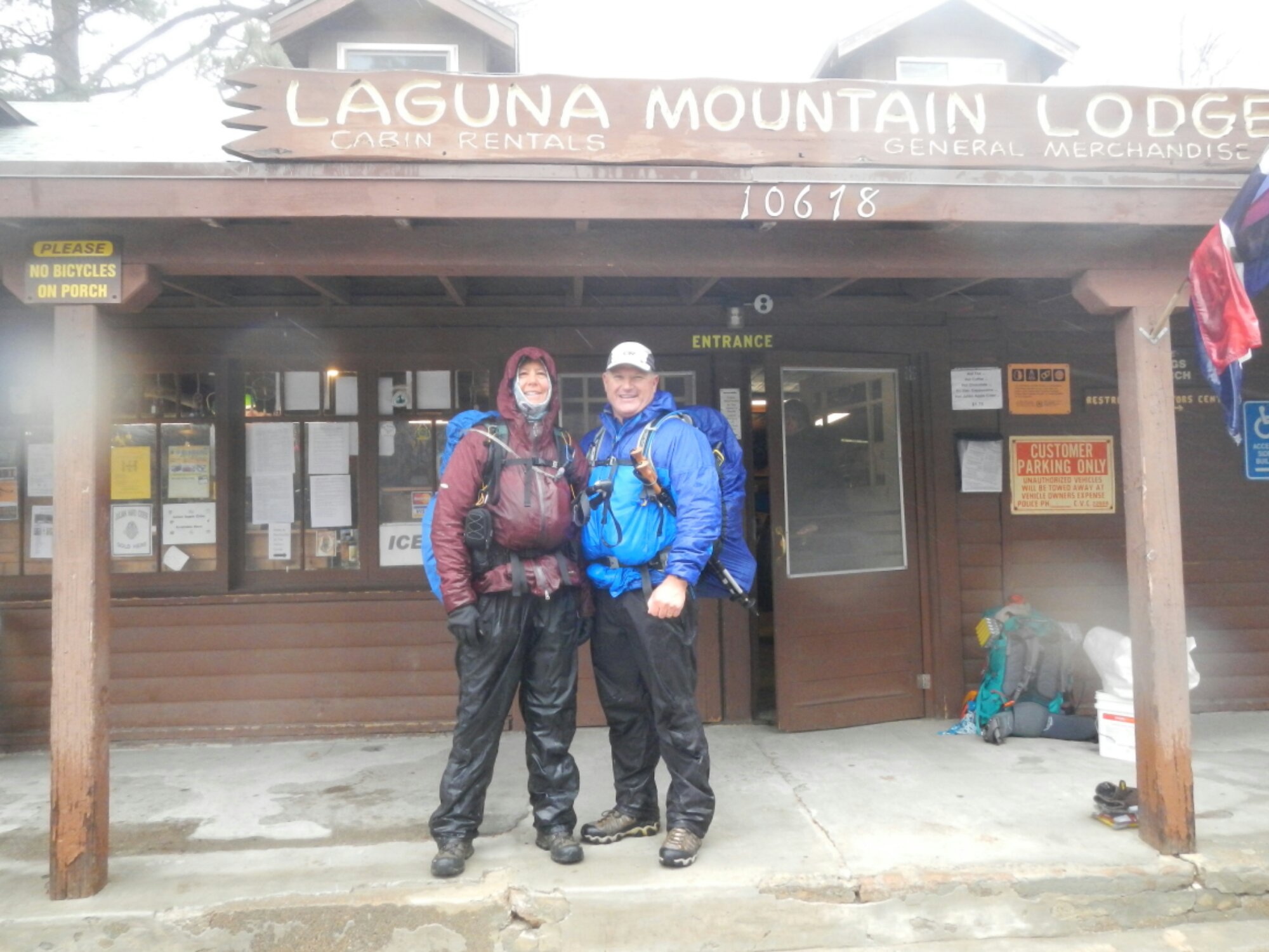…which led us to the Mt. Laguna Lodge  and store (mile 42.6) where we had dropped a resupply box. Considering we were cold and soaking wet for the most part and it was still raining (and the forecast calls for snow), we opted for a room to dry and thaw ourselves out as did several other PCT hikers we met at the lodge. Some had already done 20 miles ahead of us but called for a ride back to the lodge as they too were soaked to the bone.  So here we sit, catching up on our blog, the news, drying our gear and getting a steaming HOT shower and a beer.  If it hasn’t snowed by morning we’re out a here… dry and ready for the next curve ball Ol’ Murphy throws at us.