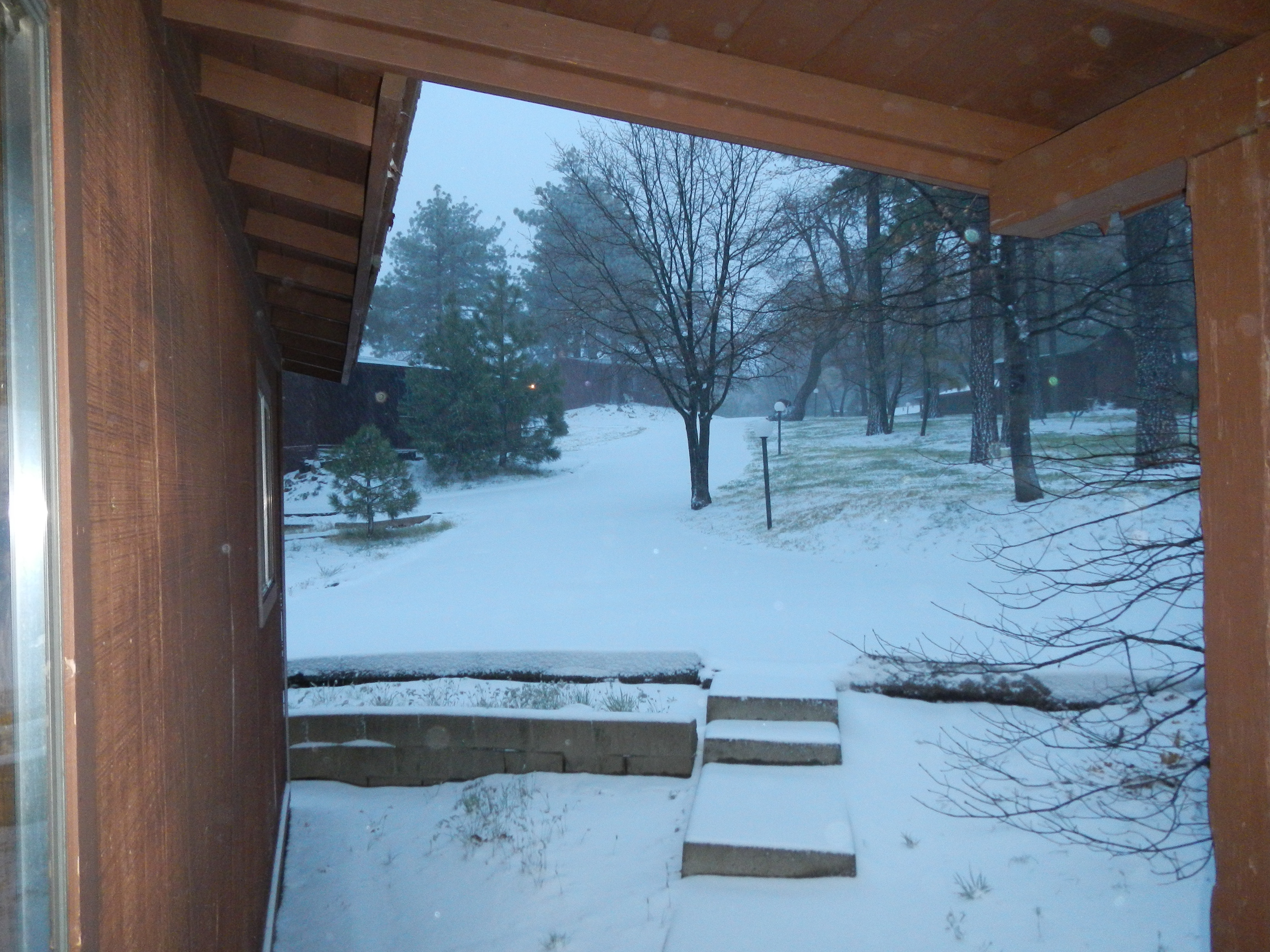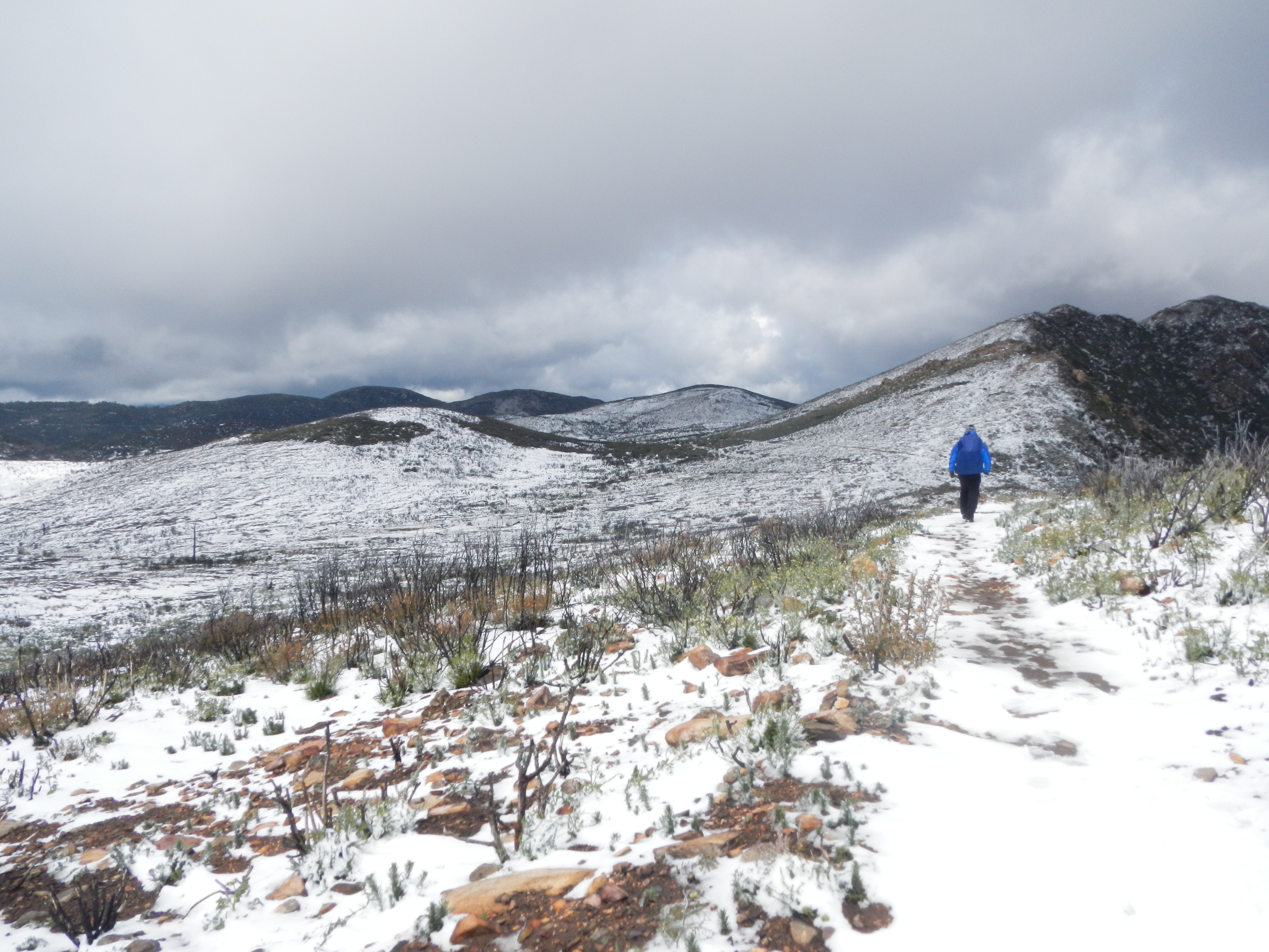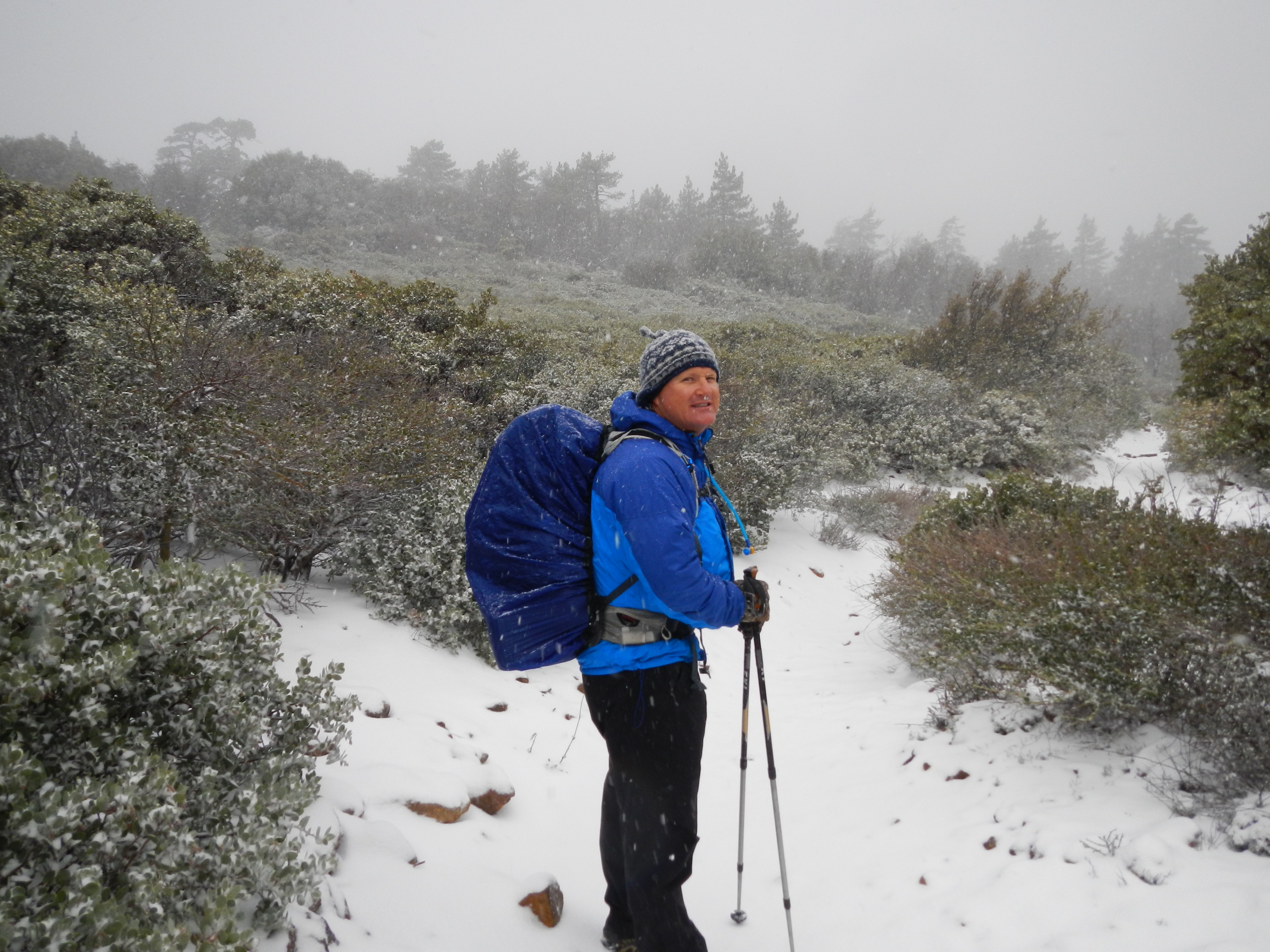 So the night before while we dried out at Mt. Laguna we met some other PCT hikers (Big Easy – cause he’s from New Orleans and his wife “Bulldog II”, cause her mom was “Bulldog I”, Thayer (no trial name yet), Alison (no trail name yet however “Little Miss Sunshine” would work on account of her constant optimism and cheery disposition), and “Paint” as in “Paint your wagon”, cause he looks like one of the characters from the movie…and he was, quite the character, and an absolute treat. He had some hilarious stories that involved found single M&Ms and a Bottle of Vodka. Paint is on his third thru-hiking attempt. It was nice to finally talk with some other thru-hikers and get their take on the trail and what motivated them to do this “thing”. Each had their own motivation, which were of equal value and made sense. As the hour reached hiker “midnight” (9 pm) we dispersed back to our respective hovels in preparation for the next days’ venture. We had decided based upon the extended forecast that we would pack our bags fully, and be prepared to leave at first light, as we had not seen glimpse of snow or even rain after we got our room…go figure. The sun actually came out and the wind stopped! This however, was the calm before the NEXT storm. Somewhere about 0300 in the morning the wind began to gust, but still no sign of rain or snow. Good so far. Beep. Beep. Beep. The alarm goes off at 0530, there’s a “light” dusting of snow (translation, 1-2 inches). We get up and begin to dress…warmly, and prepare for battle with good old Mother Nature. We take our time ensuring everything is secured and water tight. We check the weather forecast on the “smart phone” (Android), because the local new is saying diddily squat. Per Accuweather on the Android, it should clear up by 1100 and start to subside by 0900. We think, how bad can it be? It’s not like it’s raining, and besides we’ve skied in snow storms worse than this. The plan is to “walk” our way out of the storm as we, in theory, will be mostly descending in elevation, thus out of the wrathful weather. Hoods on and pulled tight, gloved up, packs secured and off into a winter wonderland we go. We drop off our room key in the night drop box and make our way down the road to join the PCT. As we pass by the Mt. Laguna store, the shop keeper is out front smoking a cigarette. We ask if anyone else has left yet (it’s 0730 in the morning). He shakes his head, flicks the embers off his cigarette and says, “Nope. You guys heading out?” ‘Yep’, we reply cheerfully. He then wishes us a safe journey, saying gruffly, “Give ’em Hell”, then takes another long drag of his cigarette shaking his head like we are crazy or something. It’s 28 degrees and the wind chill makes it more like 14 degrees. Walk yourself warm became the days’ motto. As we pass by the store, we see a San Diego Channel 10 news van. We figure they’re up here to catch some snow pictures. As we pass by the van, a female newscaster (Hannah Mullins) and her cameraman leap out of the van and yell to us, “What are you doing? Where are you going?” Paul responds matter of factly”, ‘We’re walking to Canada’. Mullens is obviously perplexed, and it’s obvious that she has no idea that the PCT hiking season is upon her, or frankly what the PCT is. She yells at us (cause the wind is gusting wildly) “Will you talk to us for a few minutes?” We look at each other, shrug our shoulders…why not, and reply ‘sure but it’s got to be quick, we don’t want to get cold’. Again Mullens makes a puzzled look. The cameraman chuckles. We do a quick interview about what we are doing, hiking obviously, and the why…bucket list, and the how far/long…2650 miles/5 months, what states the PCT goes through, and that’s we’re not bothered by the snow as we have skied in worse conditions (mainly cause we are cheap and dog gone it we’re gonna get our monies worth out of those overpriced lift tickets if we have to freeze to death to do it…and we nearly have on more than one occasion). Mullens looks to me, as Paul has done most of the talking, and asks something to the effect of what do I think of all this, to which I reply and finish the interview with ‘It’s good to play outside’. (Unfortunately none of this makes the morning or evening news as apparently icicles on the fender of their news van is more interesting. (see http://www.10news.com/news/pacific-storm-system-brings-rain-snow-to-san-diego-county) Now begins the “fun”. First order of business. Find the trail. Per Halfmile’s maps, the trail should be right off a road, just past the store. Before we take that road, we check the app on the Android. The PCT is 378 feet from our location. We walk holding it like a divining rod as we plod closer and closure to the PCT. We spy what looks like a trail in the snow, and the app says we are now 78 feet from the trial. We walk to what we think IS the trail. We are now 178 feet from the PCT! Argh! What is the matter? The arrow is now pointing in the direction we are NOT traveling. Hmmm. It appears we can not get there from here unless we bushwhack. Bushwhack it is. What the hell, we’re hiking in a blizzard, why not increased the degree of difficultly. Nothing ventured, nothing gained. Bushwhacking works. We are on the PCT and heading in the right direction…towards Canada. The scenery is glorious, childhood memories of frolicking in the snow rush over us.DSCN1343 DSCN1350 The trail is literally carpeted in snow. It was truly like walking on new Berber carpeting. Snow is now falling in large flakes as we wind our way through the pines. We are almost too warm and start to sweat. We vent our jackets to let out some heat. As the trees thin, the wind gusts from our left to our right. We put our heads down and lean toward the wind. We keep our eyes ahead surveying overhanging branches in hopes of avoiding a widow-maker (bran