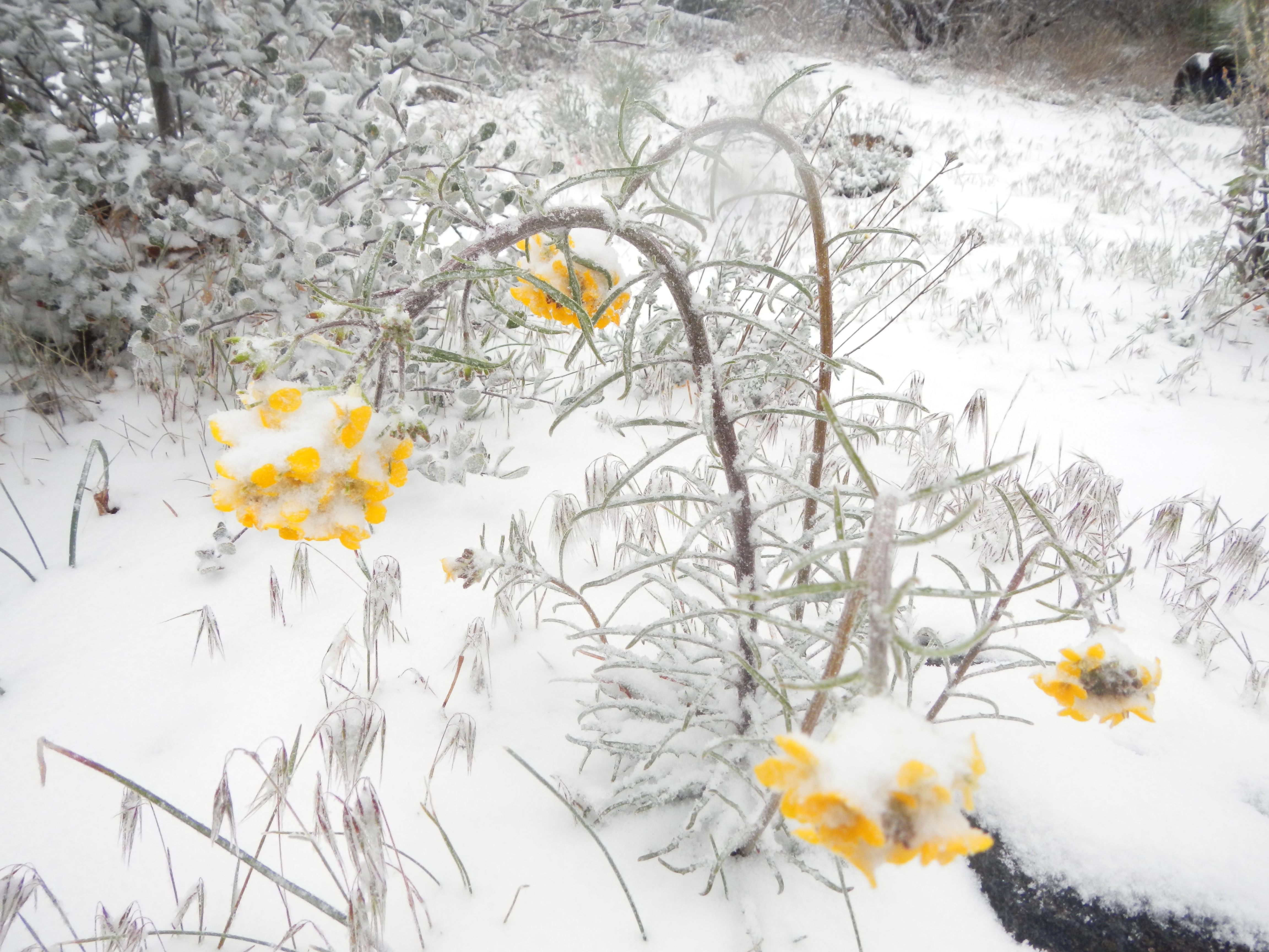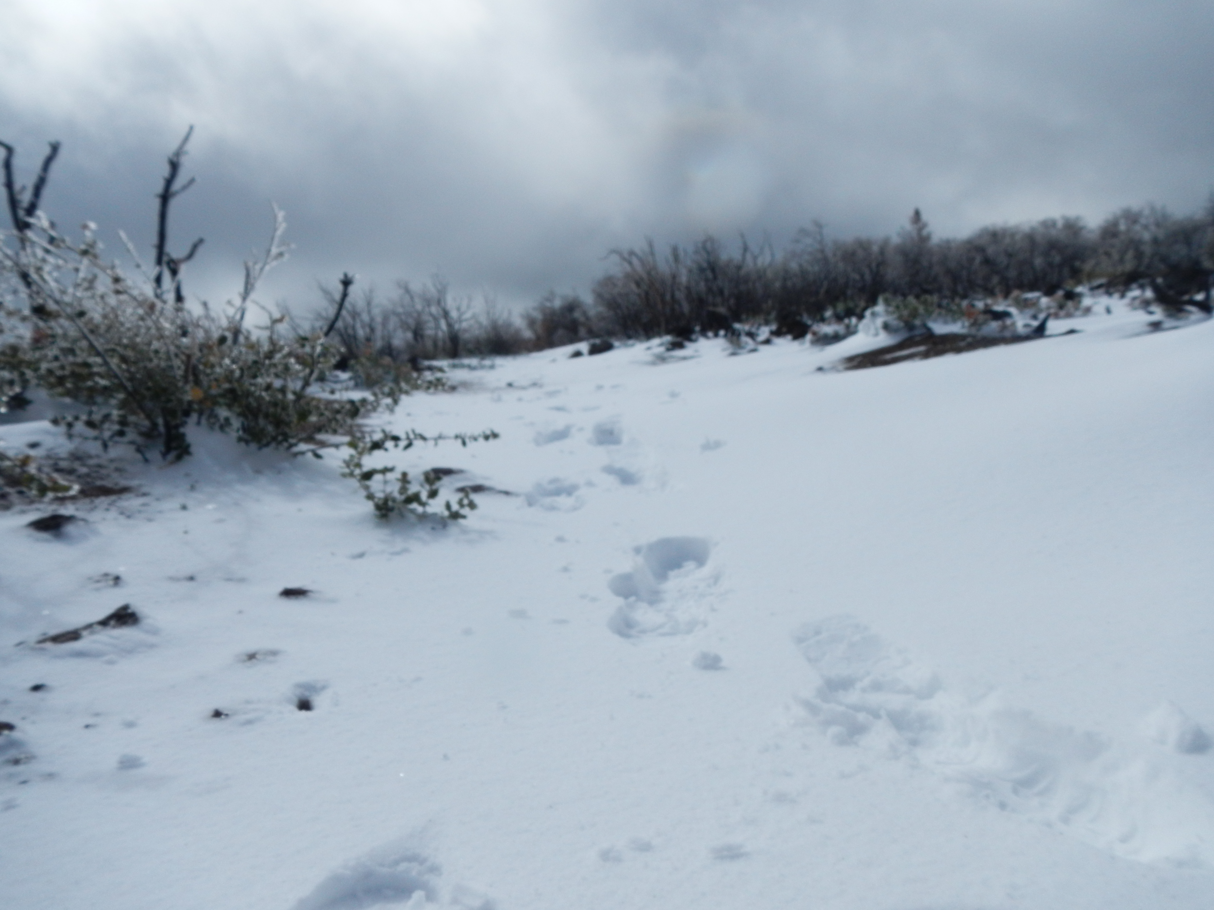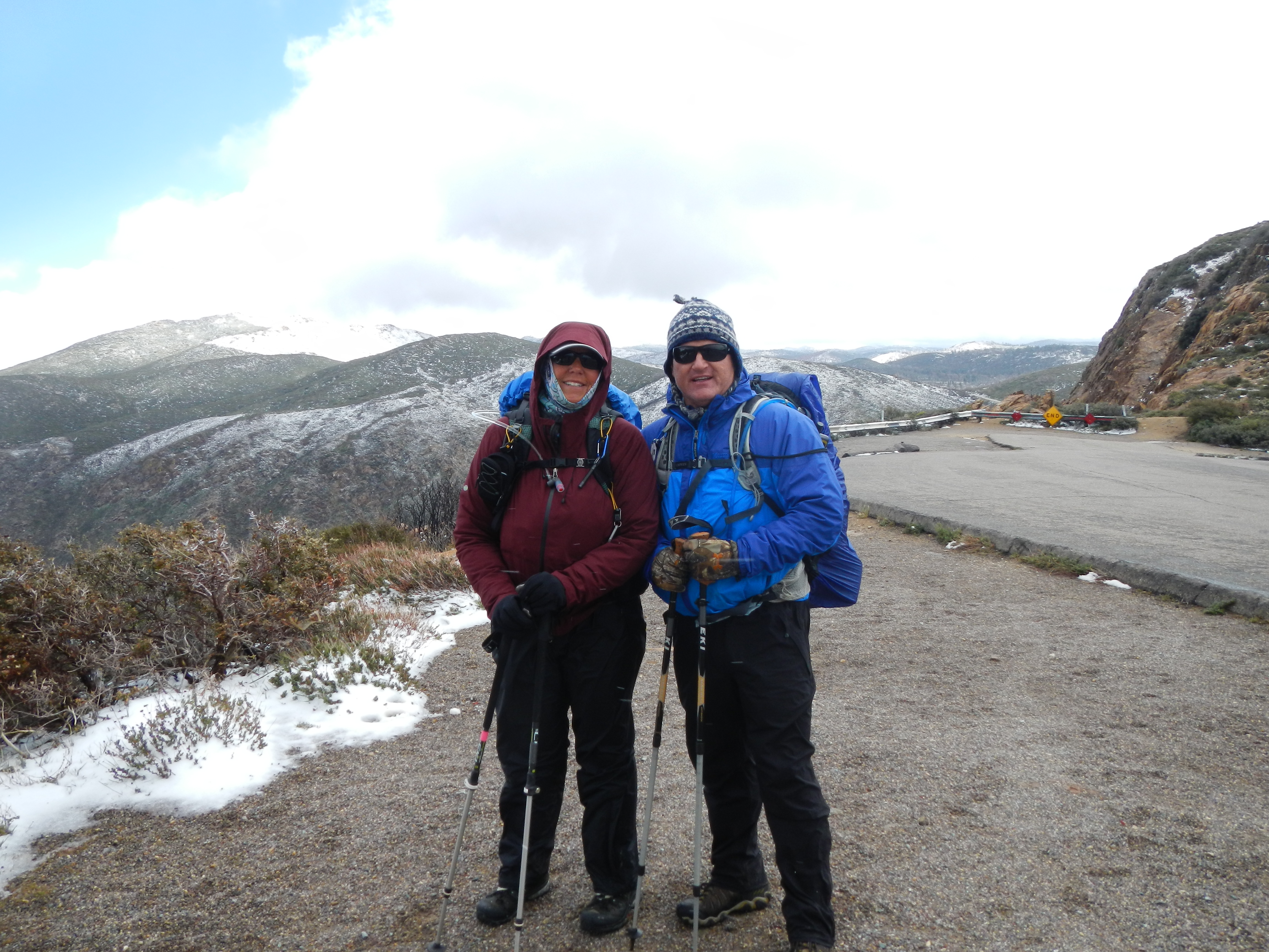DSCN1354 The snow continues as do we. We apparently both have our jobs to do, and neither will stopped or disuaded. Snot runs freely as our nostrils work overtime to stay moist and warm the frigid air. We notice bobcat and coyote tracks in the snow, and an occasional rabbit (which would account for the bobcat and coyote).DSCN1362 It appears that we are not the only ones out and about this morning. The snow dissipates slightly and the wind stays a steady 25 mph with 30-40 mph gusts that cause us to walk like drunken sailors (or lifeguards…take your pick) as we slog through wind blown drifts of snow in the trail. We walk just below an observation deck and a man who is surveying the view, hails us exclaiming, “You gotta really love nature, to be out in weather like this. Most people wouldn’t even think to do what you are doing. They’d think you’re crazy”. ‘Yes were are’ was our reply. ‘We’re on an adventure. We’re walking to Canada’. “Good for you”, the man says heartily. “Good for you!” We continue on. At times the sun peeks out, which makes us giddy. We decide to play a game of ‘sing a sunshine song’ every time the sun comes out. We sucked at that game, as 1. we can’t really sing and 2. we don’t know the words to most of the songs, we recalled that had something to do with sunshine or sun in it. Finally it stopped snowing, but the wind was relentless to the point it became not annoying or even challenging, but just plain funny…stupid funny, and so began trail delirium. Maybe we weren’t really on the PCT at all. Maybe, just maybe we had entered a time warp, walked waaay tooo far and were now on the Yukon trail.DSCN1351 Or, maybe we had traveled back in time to Robert Falcon Scott’s ill fated expedition to Antarctica.DSCN1365 The possibilities were endless and a perfect distraction as we marched ever onward, determined to walk ourselves OUT of the weather. At one point we saw tracks in the snow ahead of us. How could that be? We honestly didn’t recall anyone passing us, but then we did think we were in the Yukon at one point. We saw several sets of prints, one consistent with a female and another of two different males (it’s a man-tracker thing). It would not be until the next evening that we were able to solve that mystery. Once we reached Pioneer Mail campground, we stopped for a break and lunch. Cars would drive in and out of the campground, yet no one was camping. We half, no strike that, we fervently hoped the cars were arriving to lavish us with trail magic, like a hot drink or whiskey. Reality check…NO. No sooner had we taken our boots off and broken out lunch which comprised of some salami, BBQ chips and cheese all rolled up into a tortilla we began to be pelted by bean bag sized hail. It started off slowly, almost teasingly, then the flood gates opened and we were peppered like losers in a paint ball game. Hurriedly boots were re-applied, and whom should appear just as we were about to shove off, but Eng-Shien and Erhhung the two guys we met day one at Lake Morena, and now dubbed the “Imaginary Friends”. They earned the trail name of “Imaginary Friends” as they were always talking about their “friends” who were ALWAYS ahead of them, but no one ever saw. Yes that’s right Eng, no one, not even sweet Alison could confirm said friends existed. Ha! (inside trail humor). They had let out an hour after us and were now stopping for lunch. Good luck with that guys. Next stop, and to water up would be Sunrise Trailhead where we had stashed some water nearby the cache already there. Off into the wild white yonder we leaned. The trail out of Pioneer Mail follows what appears to be the old route for the Sunrise Hwy.