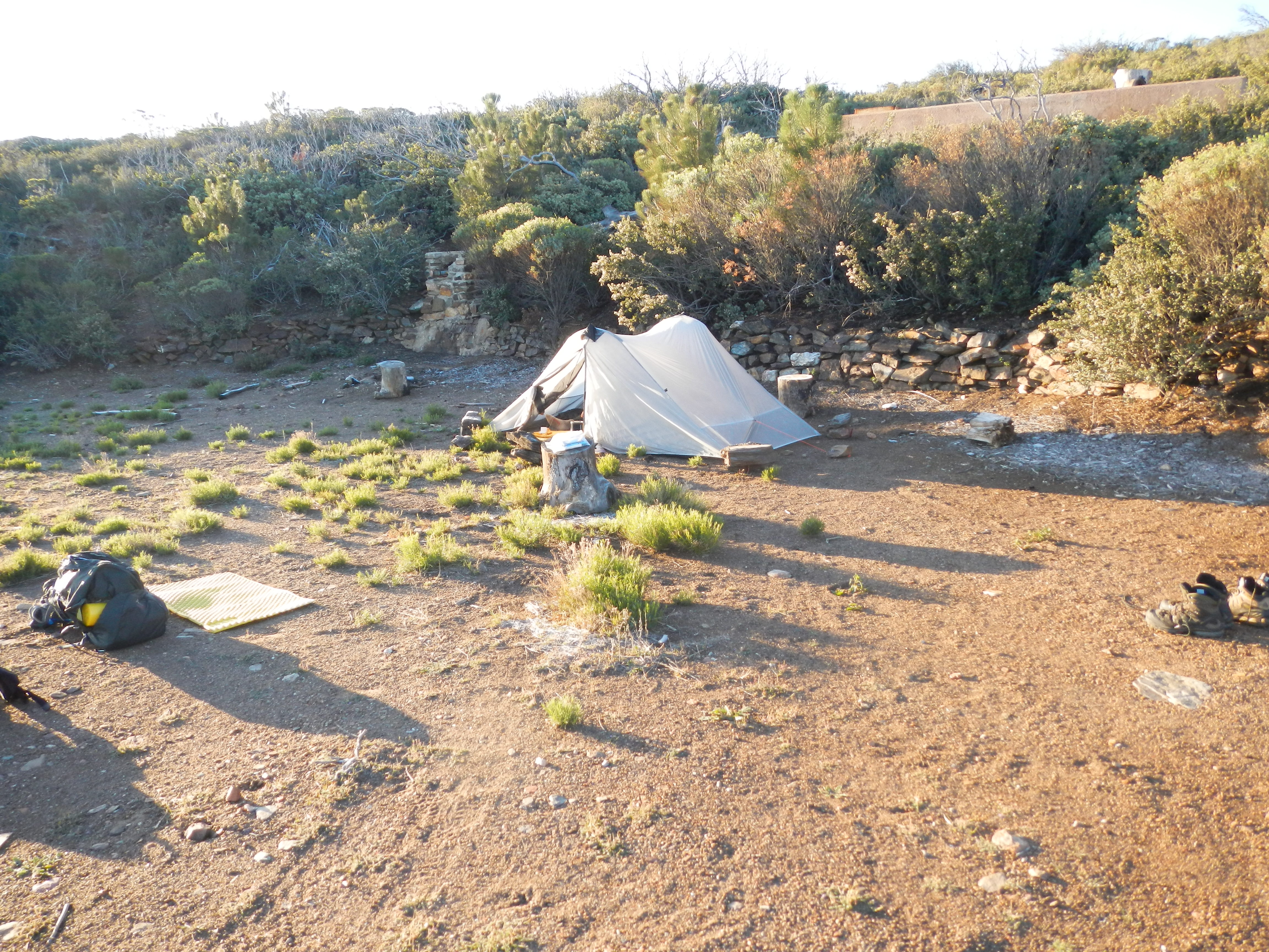 The wind had blown so hard that it had ripped Erhhung’s newly purchased pack cover right off his back without him knowing it…until stopping to get water. We discussed what our final destinations were for the day. Goal #1, to get to lower elevation and out of the wind, as for us, there would be no way in hell that we would be able to erect our tent in the current blusterfest. Mile 64 would be the goal as “Imaginary Friend”, Eng’s imaginary friends told him they were at mile 64 and setting up camp. (we later found out their “friends” weren’t there but had moved on, thus further solidifying the trail name…in our book). By mile 60 we were more than beat and not confident that we would make it to 64 before darkness had set in. We decided to invoke the “2 more miles” rule and gut it out all the while looking for a flat piece of real-estate, out of the wind. This was kind of hard to find and generally non-existent in low lying chaparell…but we kept a watchful eye out for the right spot. Soon (as in 2 more miles) we spied a dirt road off to our right. We considered its plausibility. It would be out of the wind. It appeared relatively flat, although definitely slanted downhill. It appeared well maintained. We then envisioned us being run over by some drunk off-roading teenagers in the middle of the night because they didn’t see our tent set up in the middle of the road until it was too late. Like hell we were going to have survived walking nearly 20 miles through a fricken blizzard, hail and wind storm only to be taken out by some pimply-faced wing-nuts who were off joy riding in Earl’s POS 4×4. NO WAY! So on we walked resigned to push till mile 64 and our “Imaginary Friends”. But wait, what’s that we see off in the near distance? Is that a structure? Could it be an area out of the blusterfest? Were we now truly delirious and seeing things that weren’t there? Not a chance! Low and behold, at mile 62.4, we came upon the most glorious site EVER. It was flat, out of the wind, had a pre-made rock campfire ring, and even large wooden (moveable) stumps upon which to sit comfortably, and a view.