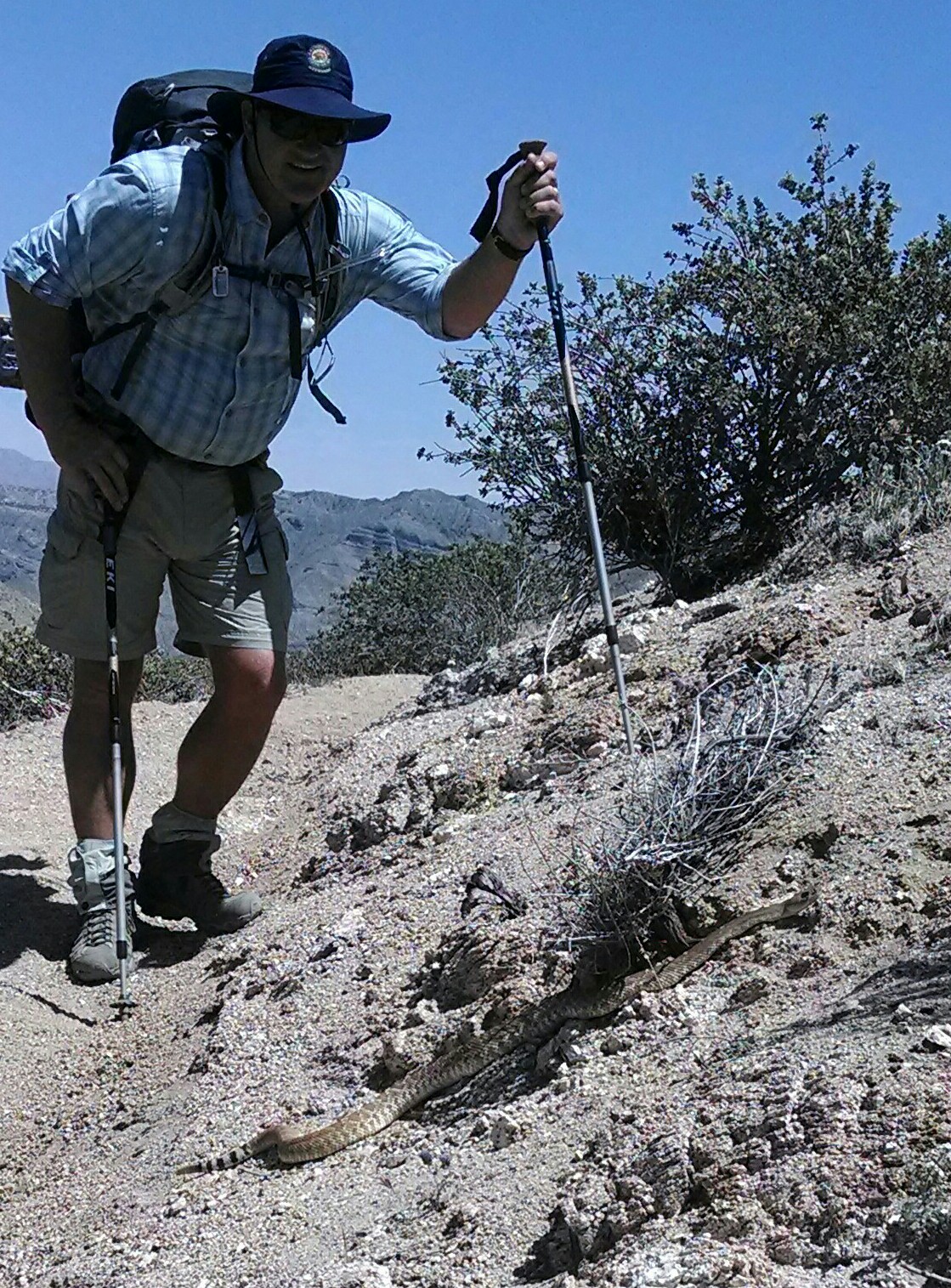 We meandered over a soft sand trail as it began to climb in elevation. The hillside was forested with windmills barely moving in the breeze. We stopped at the Mesa Windmill farm office and were treated to air conditioning and ice water. After a brief rest, a change of socks and conversation with three Russian section hikers we ventured out into the oven. The temperature had already risen another 10 degrees in the short time were watering up. The desert temperature topped out at 92 degrees…not to bad. Paul had me lead so I could set the pace for the day as we were only going to go 10 miles. As the trail traversed the hillside, Paul followed about 6 feet behind, and saw the 4 ft rattlesnake before I did, which was too late as I leaped, screamed and high stepped quickly past it as it practically lay across the trail. Paul yelled, “Geez Dee! How did you not see that?!”. I actually did see it but it didn’t register until too late. Here’s how my thought process went… ‘Hey what’s that black stripped thing in the trail? It reminds me of Bettlejuice. Ya when he was a snake with rattles on the end…rattles on the end! SNAKE! Shit! (This is where I leaped and scampered). The darn snake was not phased and posed for a picture with Paul.