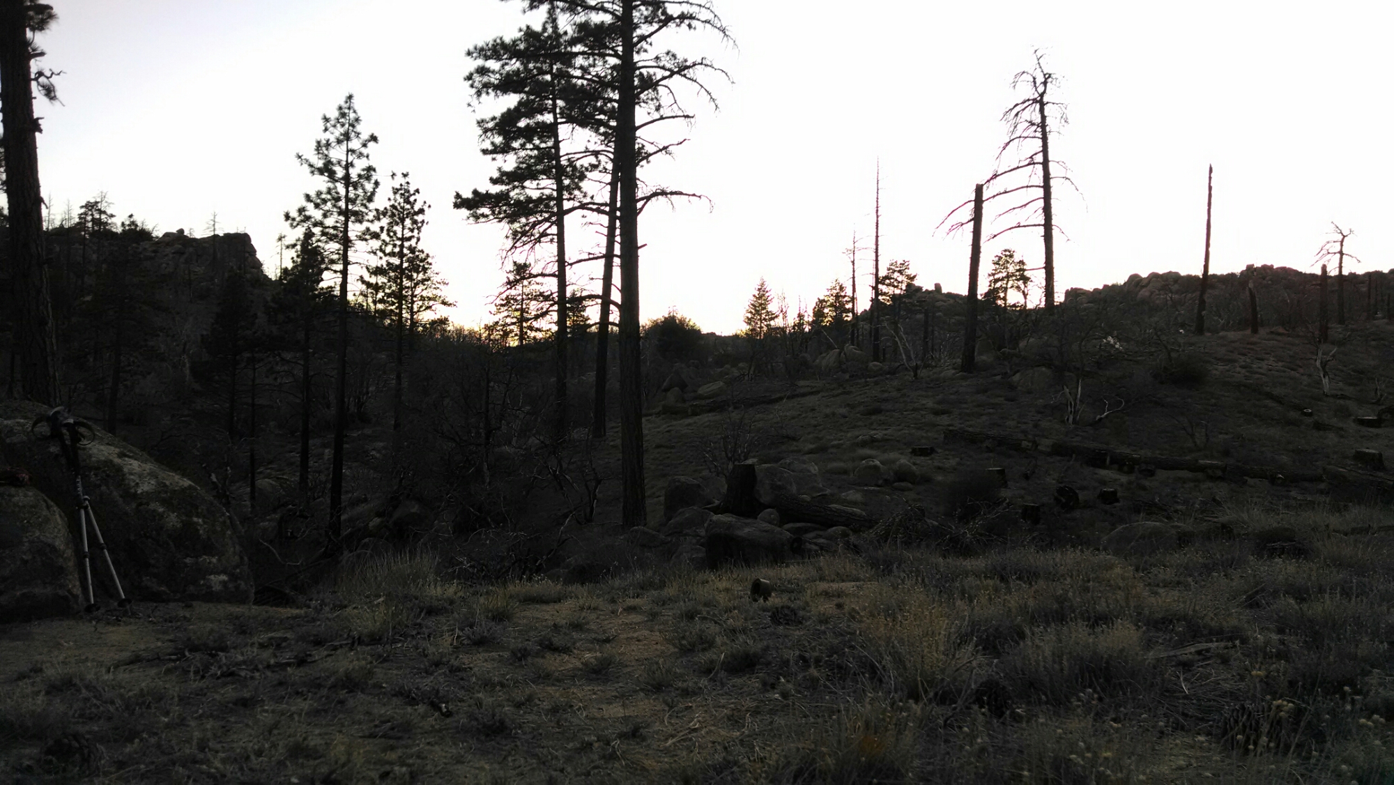We had a slight breeze, maybe 2 mph and temps no warmer than mid 70’s.  We hiked through high pines and burnt out hillsides and then down into a river canyon strewn with boulders, pines and we think maybe poodle dog bush.   (Poodle dog bush is supposed to be 10 times worse than poison oak and grows in burn areas).