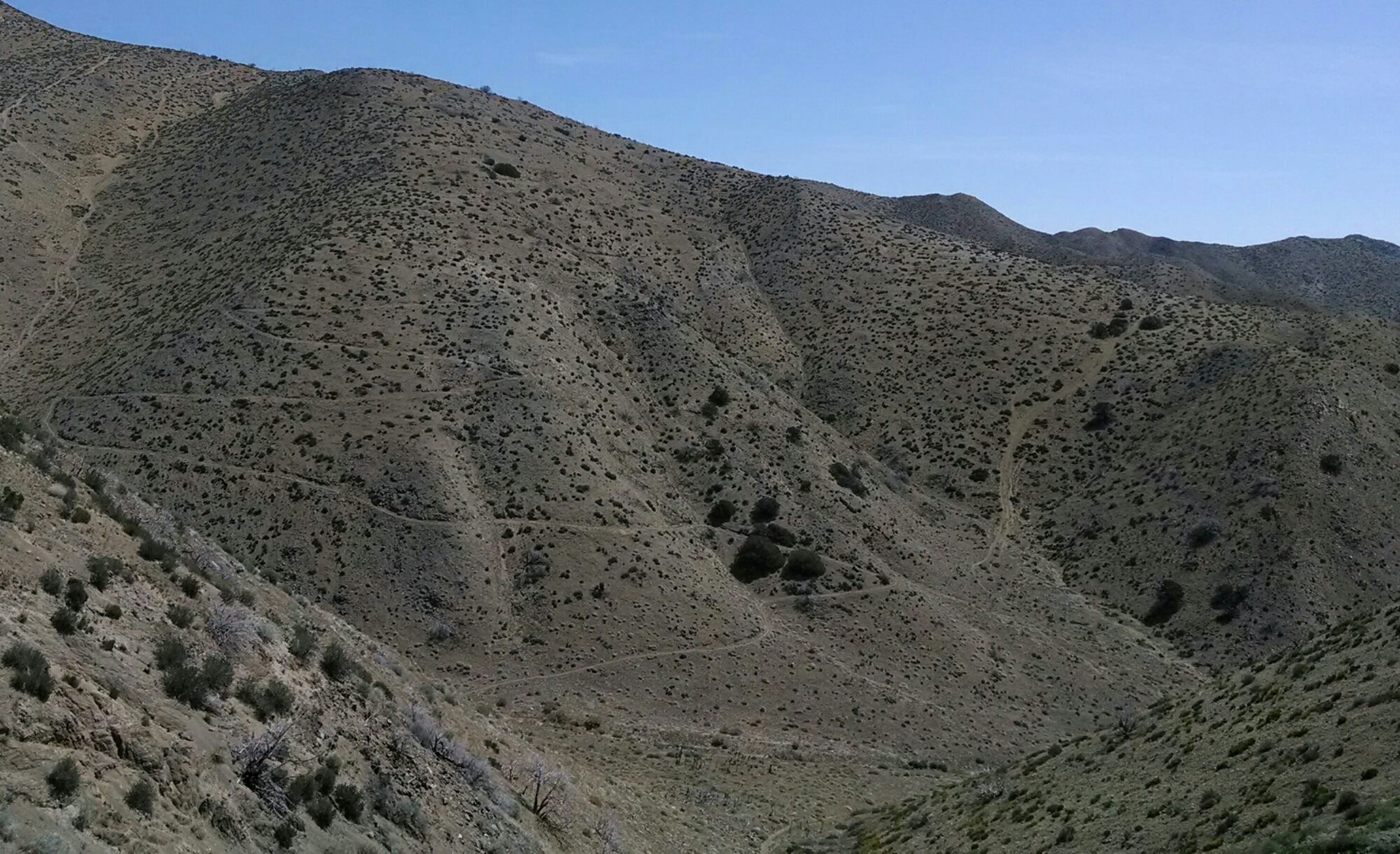 We awoke rested and still protected from the wind even though the wind had shifted and so did the faces of the blades of the windmills. We found that we really weren’t bothered by the drone of the windmills. It was perfect “white noise”, like hearing the “hum” of a jet engine on cruise control. This morning was to be a big climb day, first to the next water source and then to Willow Springs road and a hitch into Mojave. We set out early as we knew it was supposed to heat up into the 90s.