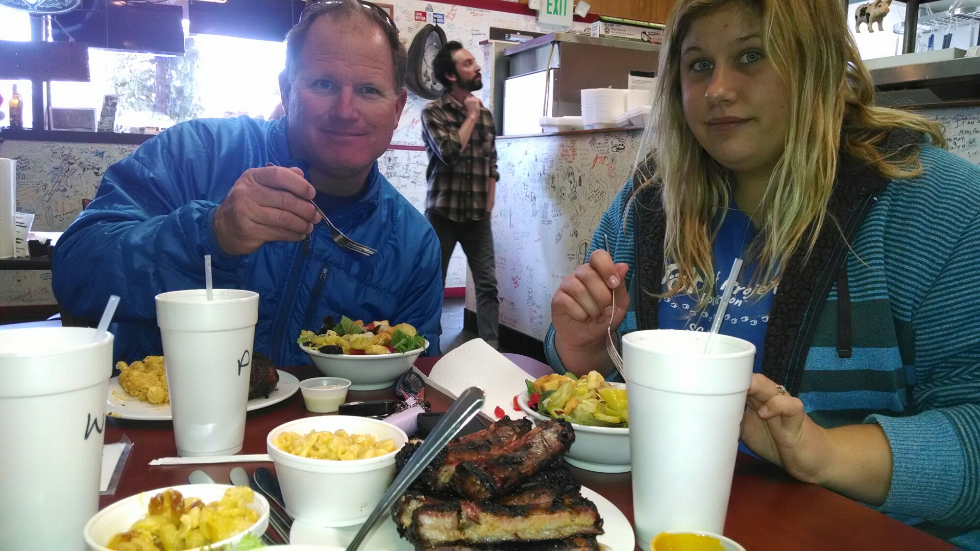 My daughter and I had ribs while Paul had chicken…all to die for and way too much to eat in one setting. We also got to write on the walls and sign our name. Paul wrote “2MoreMiles PCT 2014” on the wall just as you enter the front door. Sadly our daughter had to get going as she had work early the next day and we had to distribute our food resupply.