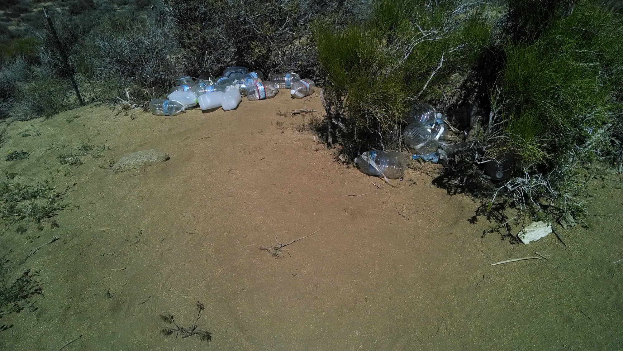 Dilemma. Walk back up to the alternate turn off nearly 3/4 miles up…in soft sand, or breathe my way through the anxiety of clambering down, for all practical purposes, a dry waterfall with 20-30′ drops. Breathe and clamber it is…crap. This water better be worth it! We get to the bottom and to Willow Springs. Lugnut #5: WTF?! Where’s the cache? Spigot is off. Trough and cistern dry as a bone. Damnit. We kick ourselves cause we knew we should have carried more water. There’s green growy stuff under the fence, so there must be water flowing or seeping somehow but we can’t find it. Maybe we missed the cache. We walk a mile further. Nothing. Time to take stock and make a plan. The sun is setting. It’s cooling off…a bit, at least we’ve got that going for us. Assessment: Paul is COMPLETELY out of water. I still have a little water in my bladder…maybe a cup worth, and half a liter(500ml) combined in two one liter bottles I carry in the side pockets of my pack; two 3oz cans of chicken packed in water; and one PowerBar fruit “slurpy” packet. We now have 12 miles to walk, up hill at both ends and in what we are soon to find out, will be soft sand/gravel. If you want to know what it feels like, go to your local quarry with a 25lb pack on and walk up the largest (1/4-1/2 inch diameter) pile of gravel they have for 8 hours. That should just about do it. Oh wait, first you have to walk on a treadmill with the same pack for 8 hours as well. It’s 6pm and we walk up the dirt road from Willow Spring for 2.3 miles staying in the shade as best we can till we reach where the PCT crosses the SC103 road. Here we find the best placed picnic table ever. We dropped our packs, looked around to see if any water may have been stashed nearby…nope. Had a snack, changed our socks, took a sip of fruit slurpy for energy and thus began the trudge. It was like one of those Thanksgiving swim workouts of 100x100s where there’s no way out of the set so you turn your brain and body on auto pilot and tell yourself to just get through it… there’s a reward at the end. This time it’s water. There are times when we step over the ATV barricades where ATV roads cross the PCT and lay inside the barricades with our feet up and contemplate just going to sleep. We’re exhausted both physically and mentally…going on emotionally as well. We’ve been up since 0530, it’s going on 10pm and we still have 8 miles to go.