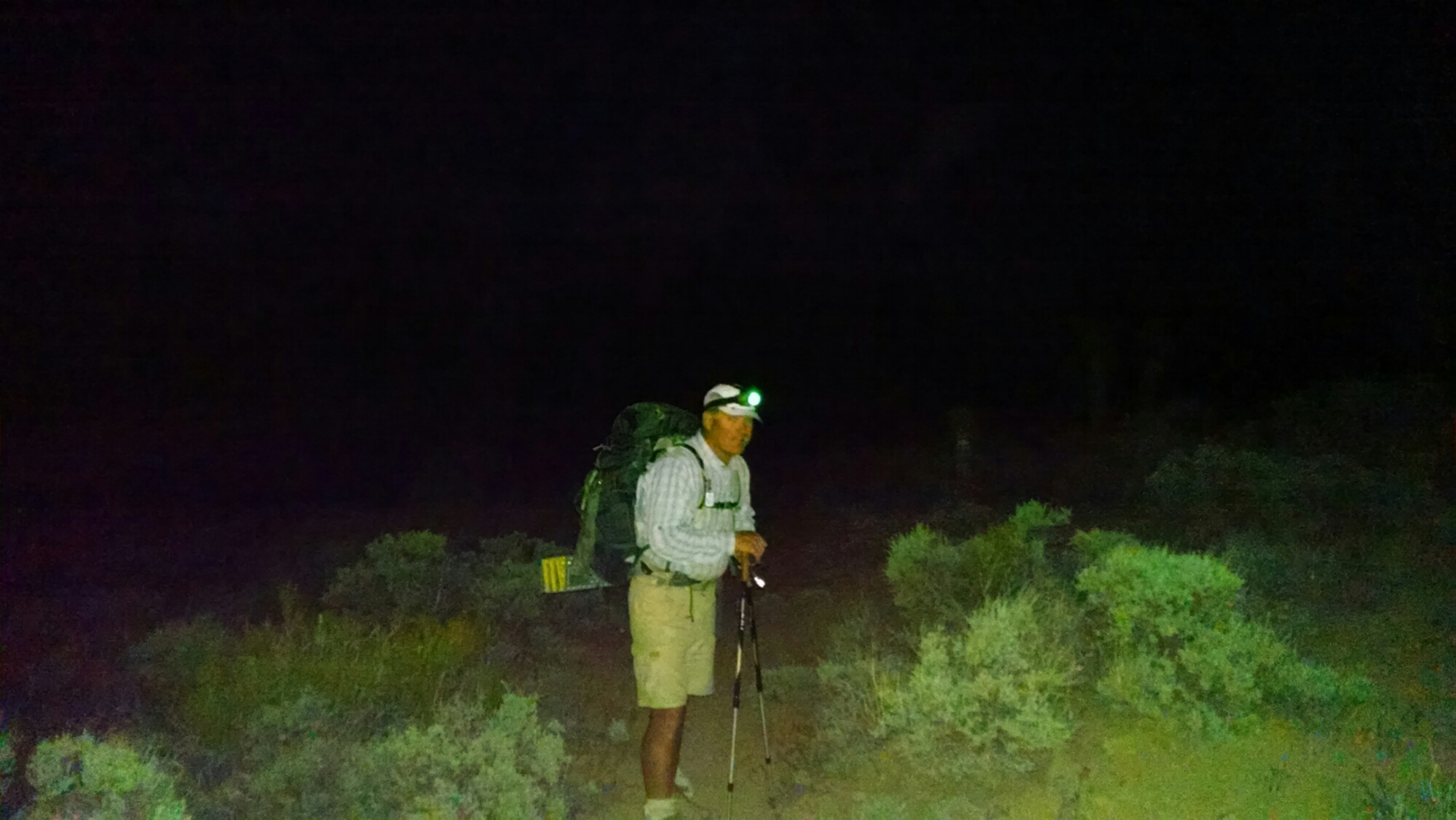 It’s a full moon and for most of the night we walk without our headlamps on and cast moon shadows. Sometimes it’s downright spooky, but mostly surreal. With 2 more miles to go we discuss our further contingency plan if the cache at Bird Spring road is dry as well. Not many options. The Delorme is looking like our best investment yet, but we’re just thirsty and no where near approaching a life or death situation…yet. Eureka! Gallons upon gallons of life sustaining water. The cache is flush…and it’s 2am. From behind a tree we hear, “Paul is that you?”… It’s Eng! He did that whole section in the heat of the day…with his umbrella. We eat and have no problems sleeping. God is good and so were all those coaches that pushed us to our limits and beyond in our younger years. Without faith, our training and experience as EMTs and those tests of our mettle, this snafu could of had a different outcome. Sweet dreams!
