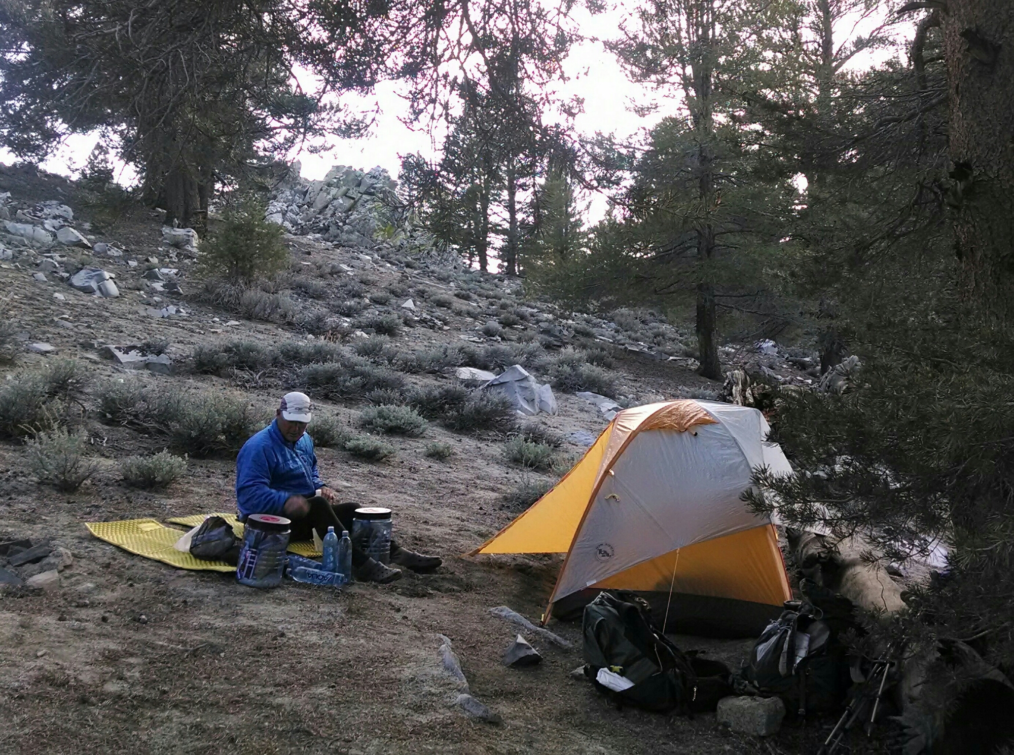 We trekked throughout the day with puffy thunderheads threatening to rain or snow on us at any moment. As we got closer to our end point for the day the sky cleared and we were happy to see clear blue skies. We arrived at the campsites adjacent the south fork of the Kern river and set up camp up the hill from the river hoping to stay warmer and dryer than the rest of the hikers.