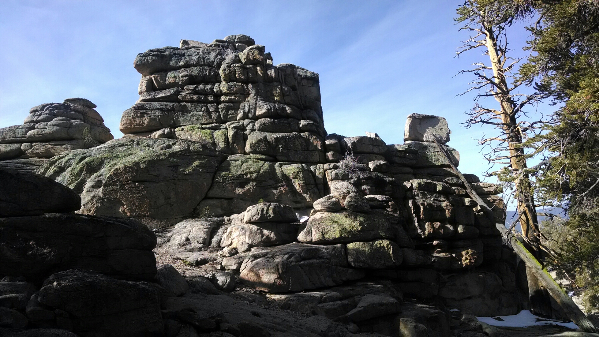 We walk on decomposed granite and through tall boulder fields stacked precariously as if a young giant had done so with a “primitive” set of Legos.  Boulder fields turn to forest void of undergrowth, yet strewn with blow downs in varying degrees of decay.