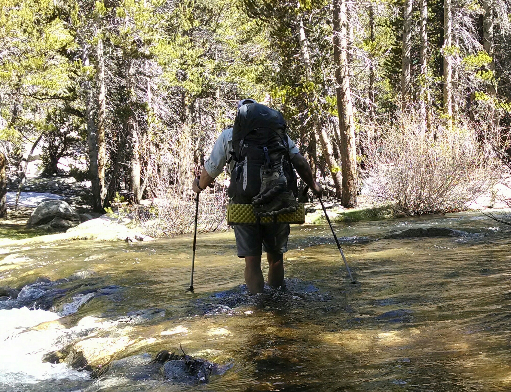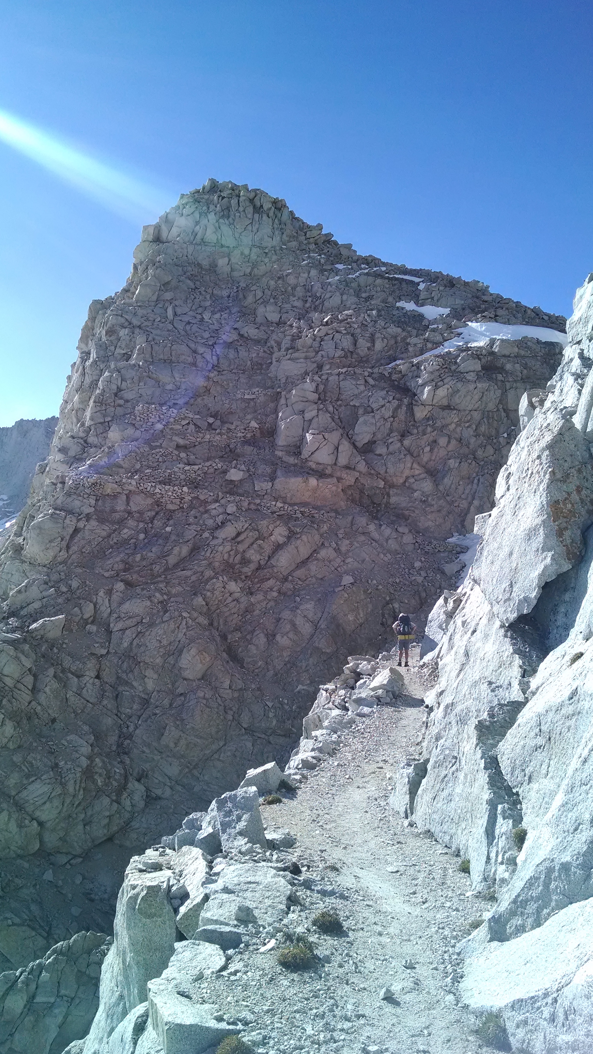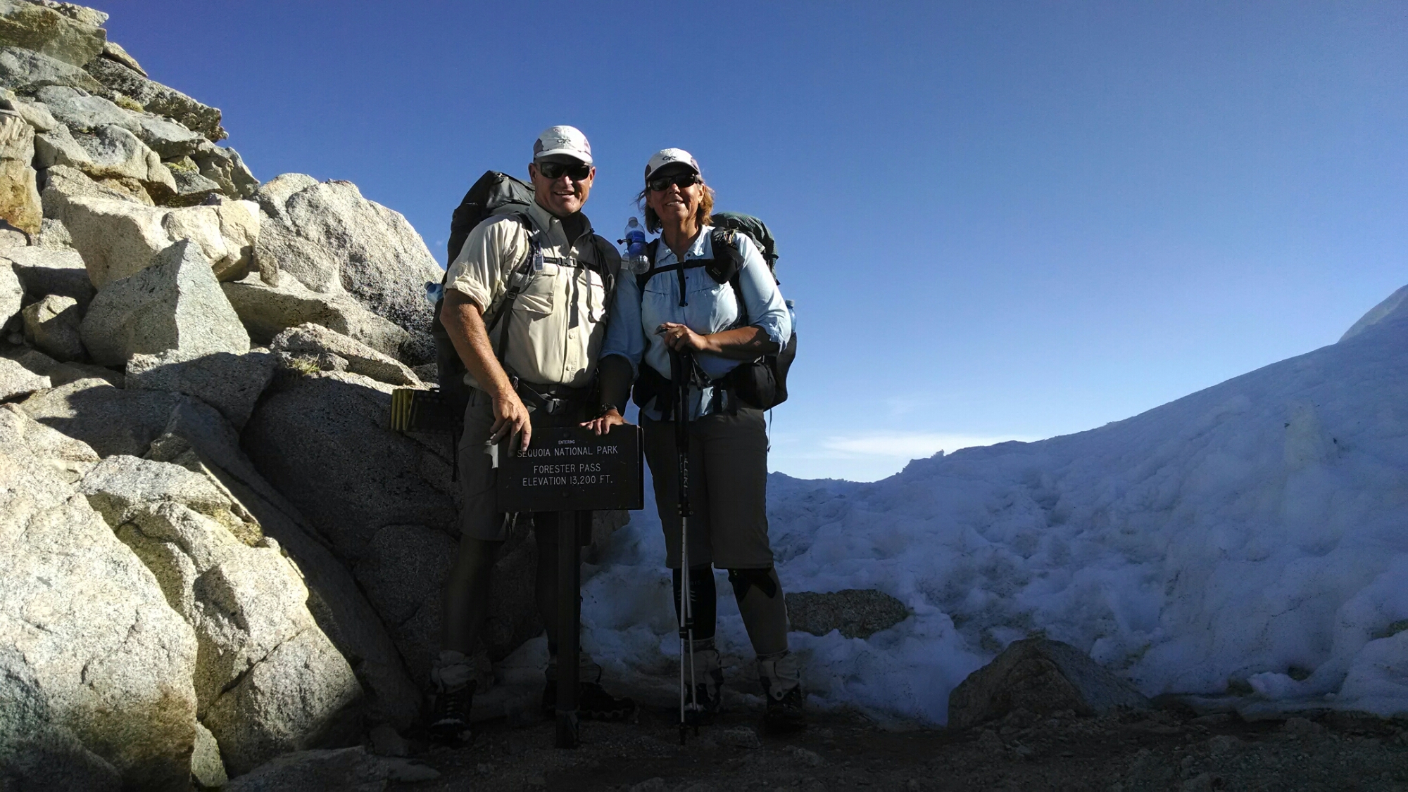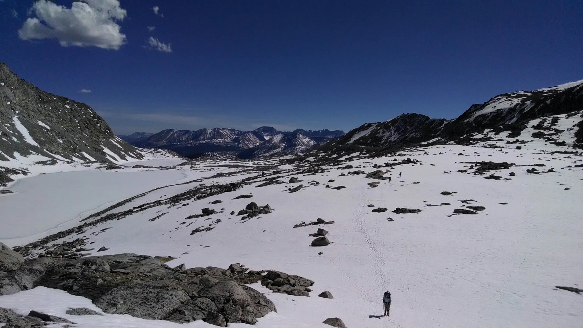 I’ll start by saying this was a very tough day. We started the day walking away from summiting Mt. Whitney. Even though we had decided to not summit last night it was difficult to hike the PCT trail going away from the Whitney Spur trail. The other hikers camped near by all left earlier with all the excitement of a new adventure. Cheering each other on as they hurried up the trail saying good bye to us. We turned our focus on our adventure, Forrester Pass. All 13,500 feet. We had about 13 miles to go to get there. The sun was out, the sky was that royal Sierra blue, and honestly the birds were singing. Our attitude could have been measured by the “spring” in our step. We hiked through tall pines and past wide open meadows. We saw two deer feeding and couldn’t resist checking to see if they were bucks. They were! A small forked horn and a nice 3×3 or possible 4×4, hard to say with out some binos to see better. When they walked away the larger buck’s antlers were well outside his ears, still in velvet. It seemed like a movie. A picture perfect setting, with the wildlife you would expect, on a beautiful day. Life is awesome!