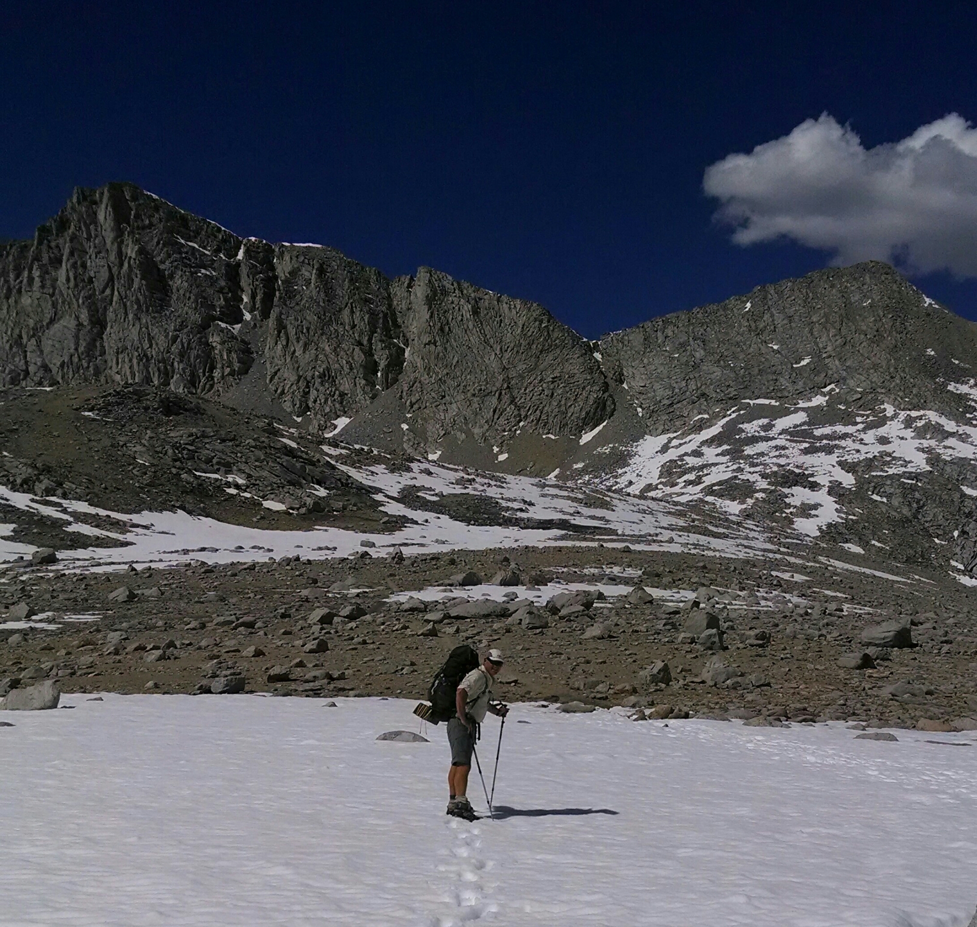 We ford more icy creeks and lunch on the bank of Tyndall Creek. It’s here that we met a couple, our age, section hiking, eating lunch too. We get the usual questions about the trail and then the question, “When are you going to climb Forrester Pass?” We say today. They respond “Today?” That should have been a bigger clue , especially after they had earlier mentioned they’ve climbed the pass on a earlier hike. We have what Ten Speed later referred to as”Thru Hiker Tunnel Vision”. This means we push on, defying common sense.