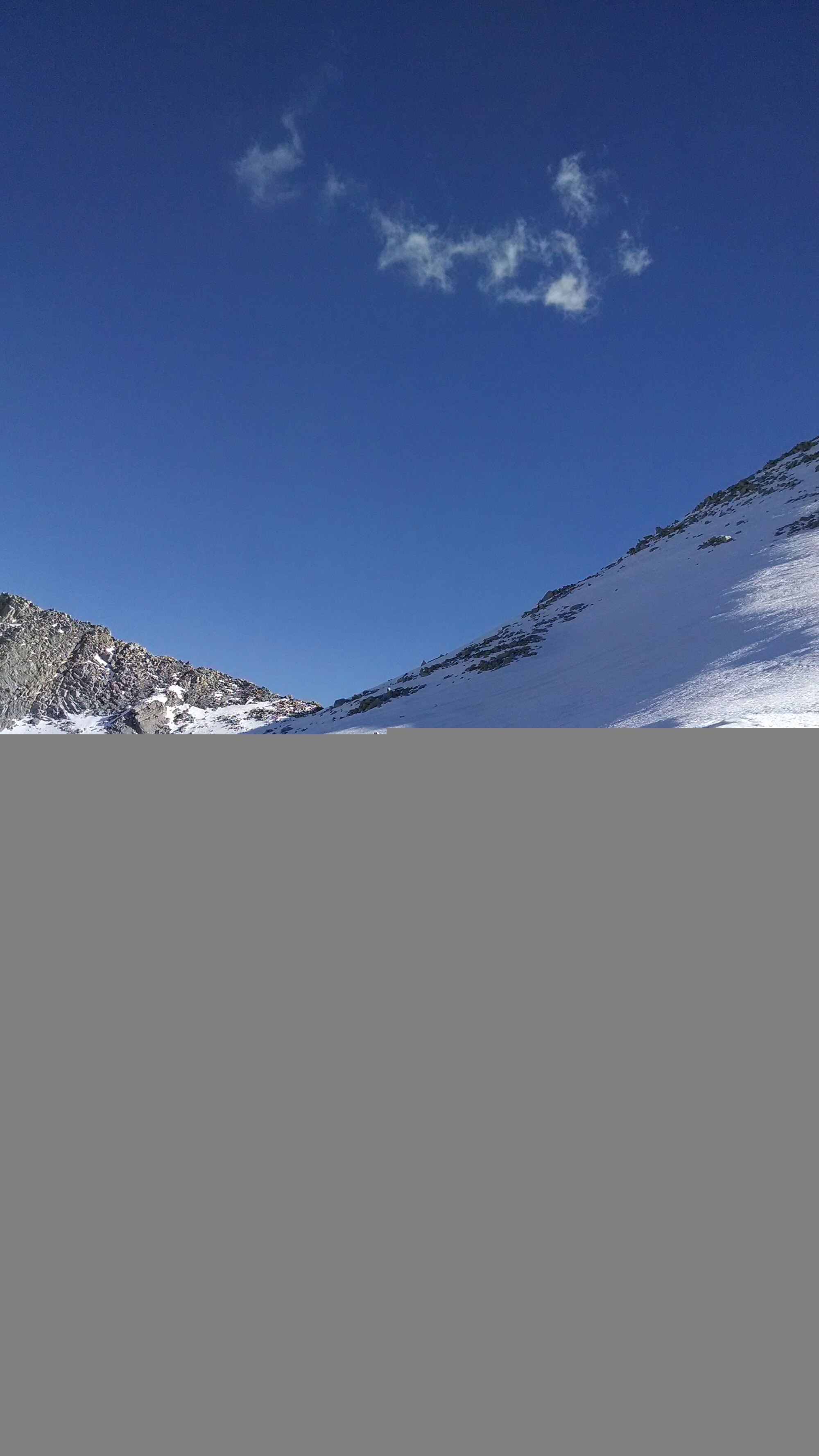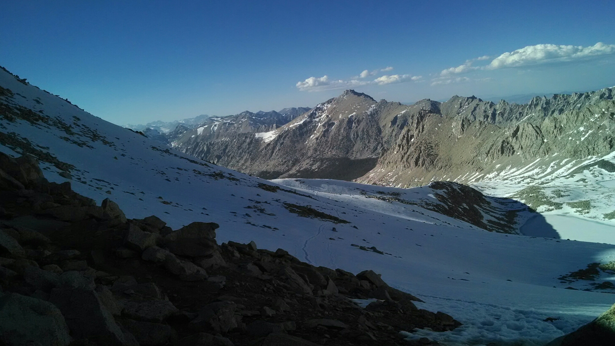 It could be anywhere. We stop several times and make guesses. I remind Paul “We can wonder all we want, or we can wander and find out.’ He rolls his eyes, having heard this a thousand times. We push on as the trail turns to foot prints in deep snow…another clue. We “posthole” for the first time and laugh, yet continue following foot prints not knowing where the trail is actually located. From time to time we can see the trail in the open spaces clear of snow, but the trail winds around large boulders in every direction who knows where we’re going. As we close in on the face of this gigantic bowl, we see the pass. It’s way the hell up there and it has a very, very, slim chute. Several long steep switchbacks are now visible. Some covered in snow, but all look intimidating. Between us and the switchbacks is snow and boulders sloping up the mountain. We posthole about calf deep over and over, and then decide to take the boulder route. Climbing over boulders focusing on the switchbacks thinking, we “got this.” Tunnel vision anyone? This isn’t “that bad” we say, taking no thought of what lie ahead on the other side…how bad can it be, right?