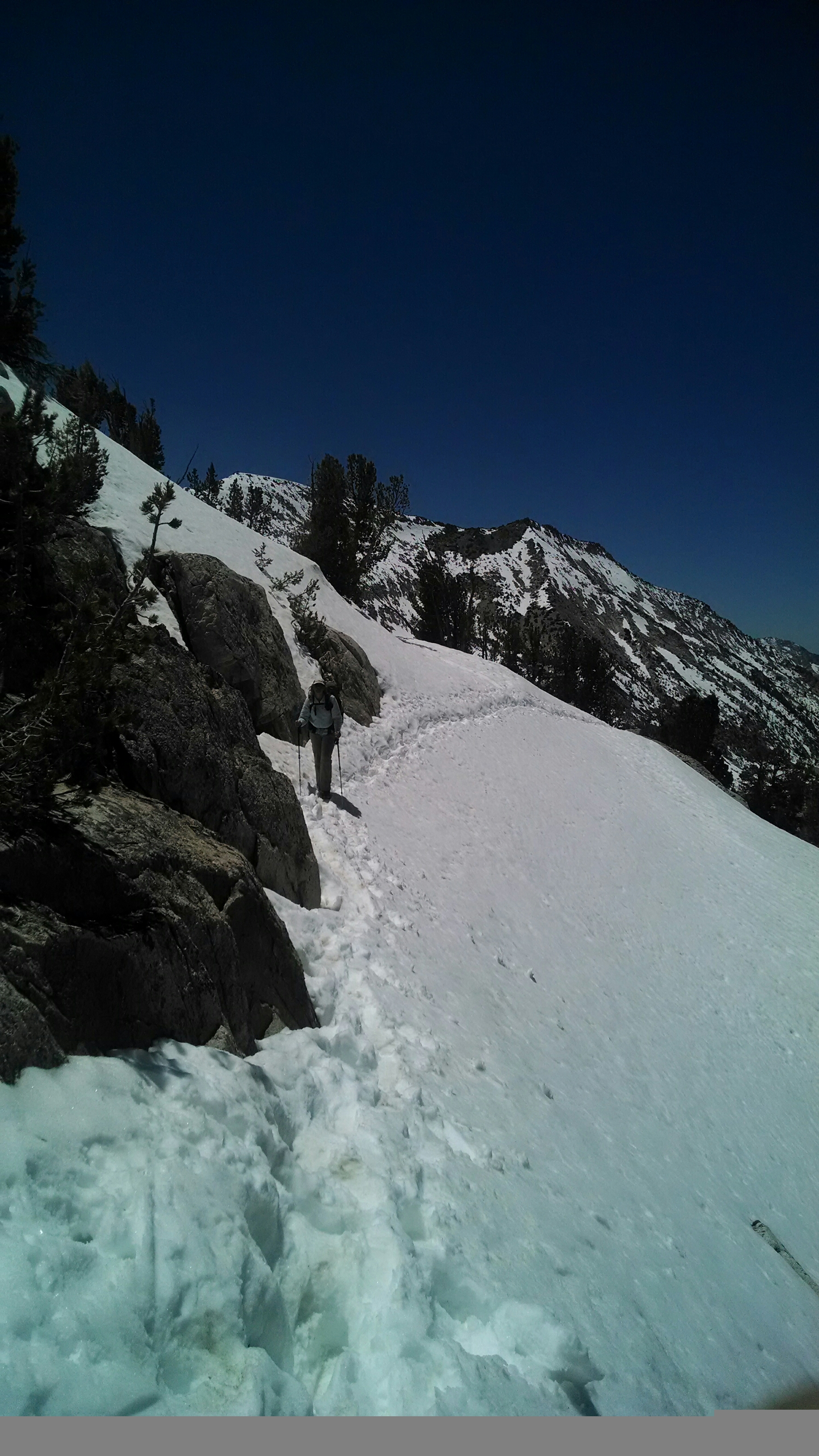 The initial climb was steep with some snow on the trail, that led to some post holing, but liveable as the snow was well compacted. The climb to the top of the pass was steep and arduous. I was pretty much gassed by the time we reached the top. Then the backside, snow once again as far as the eye could see, and unbelievably steep too.