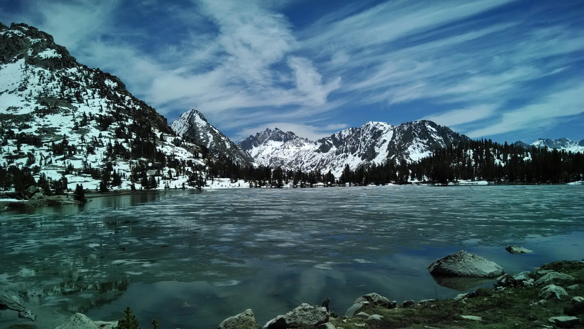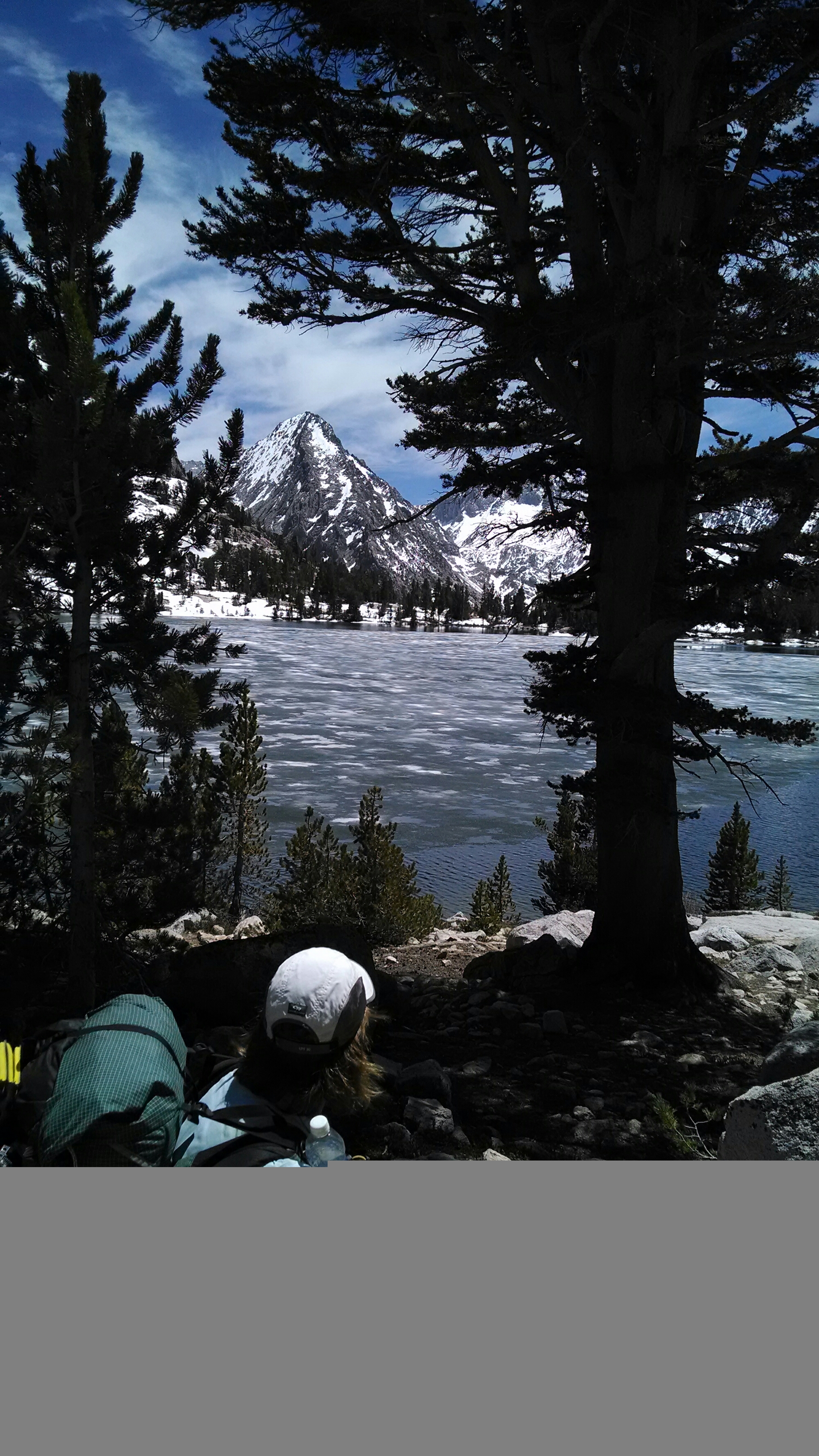 We doned our micro spikes and got a move on. We had some serious miles to do. It was nice walking on top of the snow rather than in it. When we stopped for a break and to stow our spikes (they worked great for river crossings with logs too), the couple from the night before caught up to us. They said they battled hypothermia through the night but did not think to start a fire…only sleeping bag and hot tea. They were stopping for a break as well, but we had to keep going. We got this “bright idea” to take the Bullfrog trail off the PCT/John Muir Trail, that meets up with the Kearsage Pass trail.