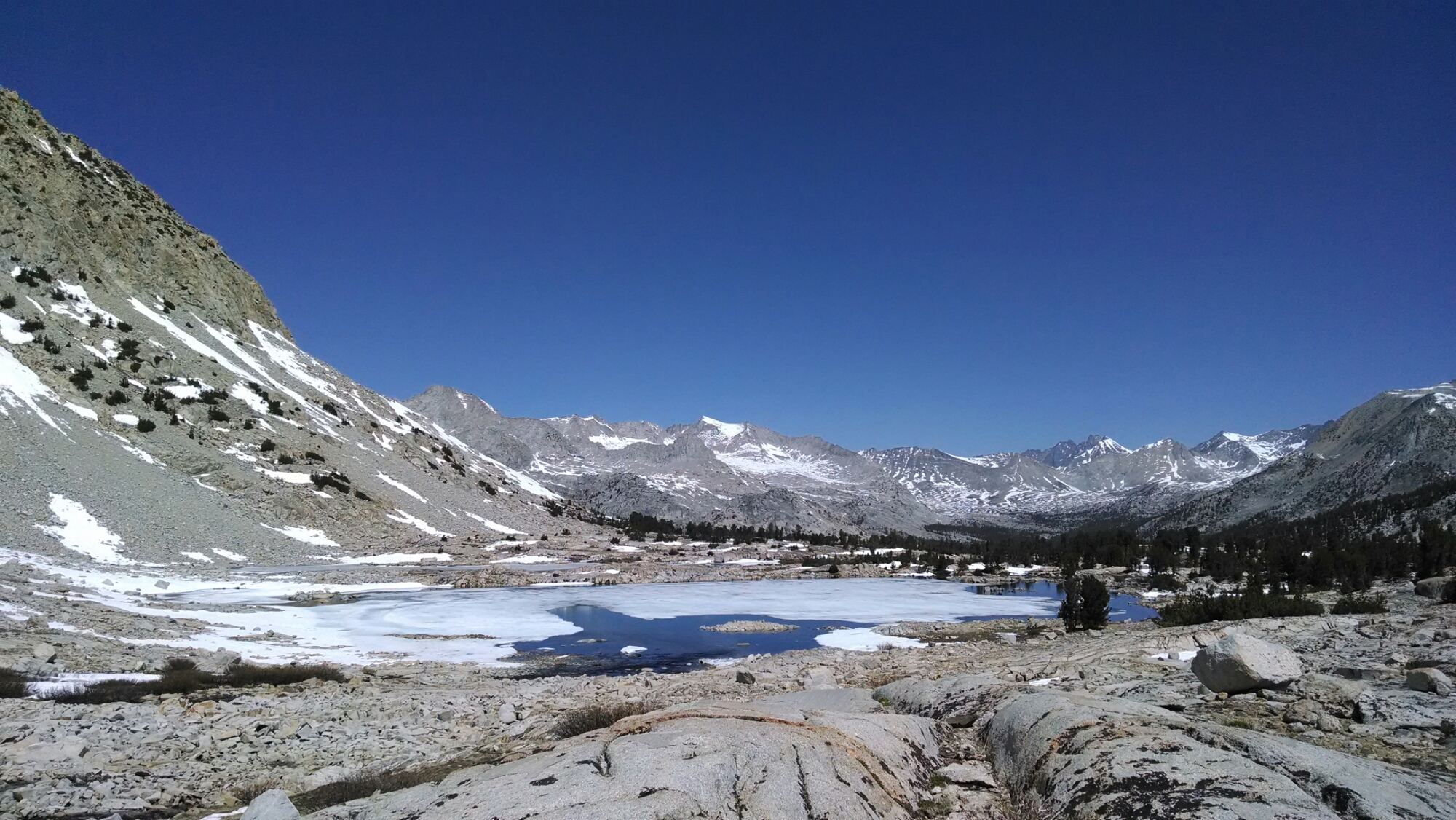 Rags! He shared the same candy with us last night after dinner. We smile and laugh. He understood what we had just gone through. Or at least me. Thanks Rags! We needed something positive to lift our spirits. Down we went as quick as we (me being the pace setter…if you can call it a pace) could, trying to make up time. We both were still feeling stupid for following tracks and not completely verifying them with the maps. We vowed to never make that mistake again. After several miles we cleared the snow having dropped elevation and find the trail. We stopped for a well deserved break and agreed we were not going to make the miles today we had set out to make. Stuff happens! We had hoped to make it over Mather’s Pass today too. The decision was made  to get to the base of Mather’s Pass, make camp, and climb the pass very early in the morning. This will put us a day behind and we will have to rethink our food supply. The day continued “normally” as we made our way up toward Mather’s. The views of the Sierras are incredible. With the snow melt increasing, waterfalls cascading from above are more common. Even though we are physically and mentally worked over, we haven’t become callus to either the views or waterfalls and point them out as they come into view. Most of the time you hear the waterfalls well before you see them. Making it over or through the creeks/rivers is becoming more difficult and the temperature of the water is so cold that your feet ache beyond belief. Late in the afternoon we had several creeks to ford and after several successful crossings we reached the King River. We don’t like cold wet feet to hike in and because your shoes freeze solid at night we prefer to take our boots off and cross in our camp shoes(crocs). Well, as if today already wasn’t rough enough, one particular crossing didn’t go well. Paul made the crossing and waited for me. I made the crossing, sat next to Paul, and began to dry my feet when I realized my boots were missing! Paul in disbelief and after saying some choice words, along the lines ” You’re kidding!”, begins to frantically search where I had crossed.  Down stream he goes weaving around bushes and rocks looking for my boots. By now I’m thinking of writing a book on how I crossed the Sierras and snow covered passes in a pair of Crocs. (Sheryl Strayed eat your heart out. Oprah, or is it Queen Lateefa, here I come!…trying to make lemonade here) I see Paul enter the river 75 yards down steam, reach down, and then hoist my boots in the air. Thank God!!! No really… Thank God!!! If I didn’t have a trail name already I would have earned one here. I’m sure you can think of a few. Feel free to enter them in the comment section. After my reunion with my boots and Paul finally stopped looking at me and shaking his head, we had a good laugh. The type of laugh you have after having the crap scared out of you. I lace up my seriously soggy and hopelessly waterlogged boots and trudge on.  This time there is no need to remove my boots or even rock hop for further creek crossings…at least I got that going for me.  Paul remarks that I’m a “real “Thru-hiker now.  Around five o’clock we reach the base of Mather’s Pass and make camp. 8 miles! It feels much farther.  It will be good to put an end to this day but not before a hot rehydrated meal. Tent set up, sleeping pads inflated, sleeping bags laid out, time to boil water and eat. Not! The day is yet not over and we run out of fuel and eat a cold meal. We recount the day’s mishaps.  How many?  We know things seem to run in three’s.  Do we have anymore to look forward to or be prepared for? Hmmm.  Wrong Pass, mutinous boots, out of fuel (with 3 more days to go…at least), that makes three.  We’re good.  Tomorrow will be a seriously better day, but then there go the talk shows.