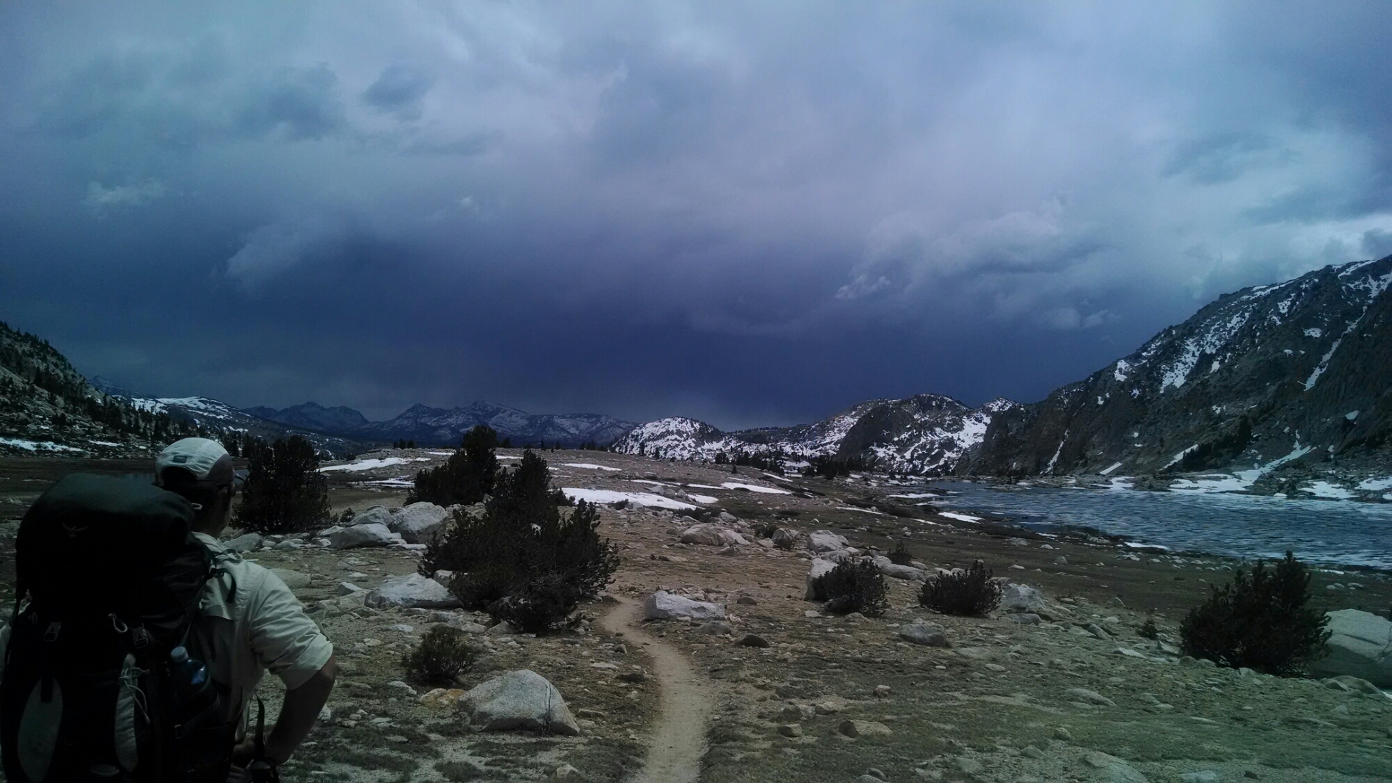 Slept in a bit…food coma again, but still up and packed in time to score breakfast and a boat ride back (actually nearer) to the trail that will intersect with the PCT.  The harder and faster we walk, the sooner to Mammoth.  We’re jonesing for a real bed, a shower (if not a jacuzzi) and new shoes.  Mileage today was fairly uneventful… Unless you count being caught in a thunder/lightning storm just as we came over Silver Pass…we have all the luck!