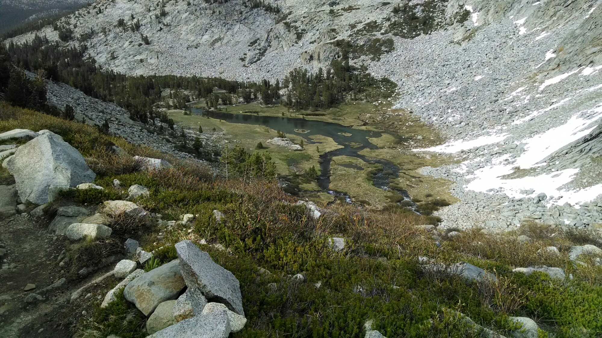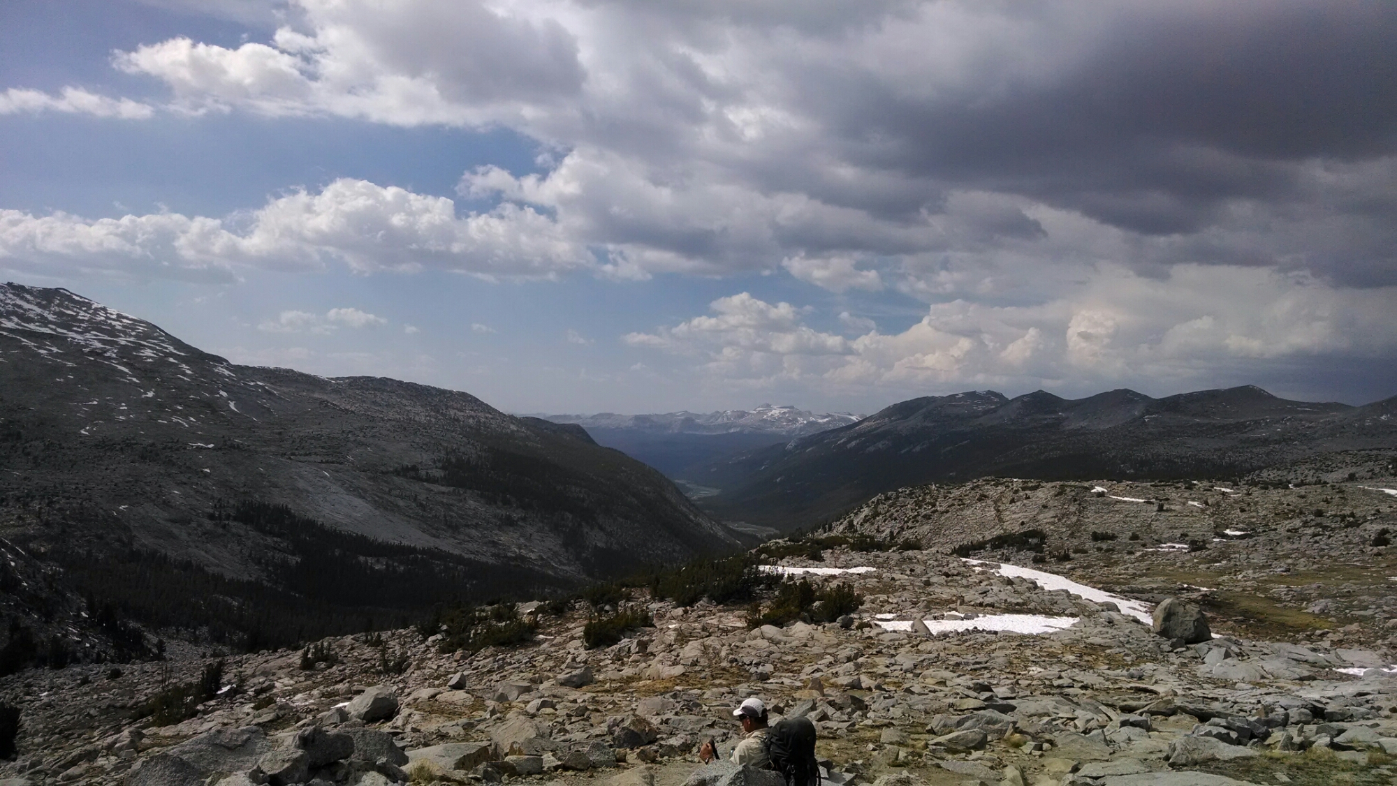Finally the trees end and there are nothing but boulders and large peaks ahead. Paul assures me its up to the left and up we go. We climbed over rocks, boulders, and slabs as the trail weaved up to the pass. As we crested the top we could see Lyell Canyon (actually a green valley) and the Lyell Fork of the Tuolumne river. Beautiful!!! Down in the valley is where we will camp.