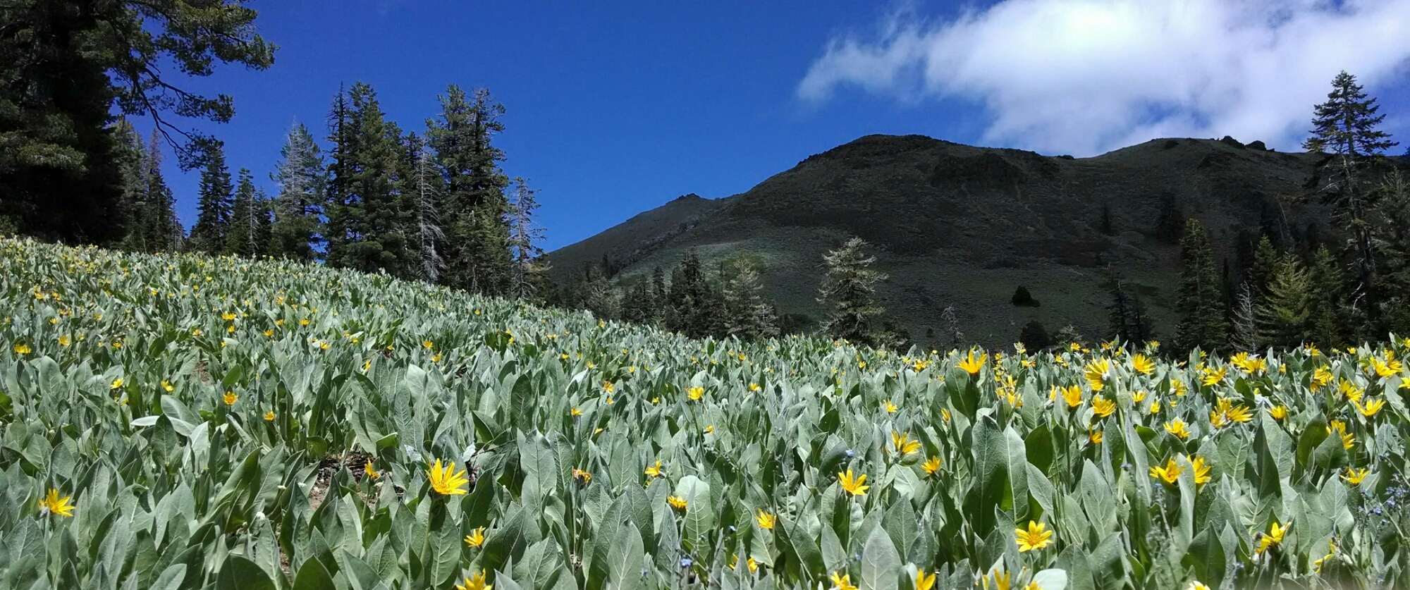 The hillsides are covered with mule ears in full bloom. The sun comes out full force and we hit a thermalcline that makes me regret the rain pants. They feel like those sauna pants that wrestlers wear to drop weight, and are probably having the same effect. I almost cave, and take the time to remove them, when we turn the corner and whoosh! Wind. Big. Freezing wind!