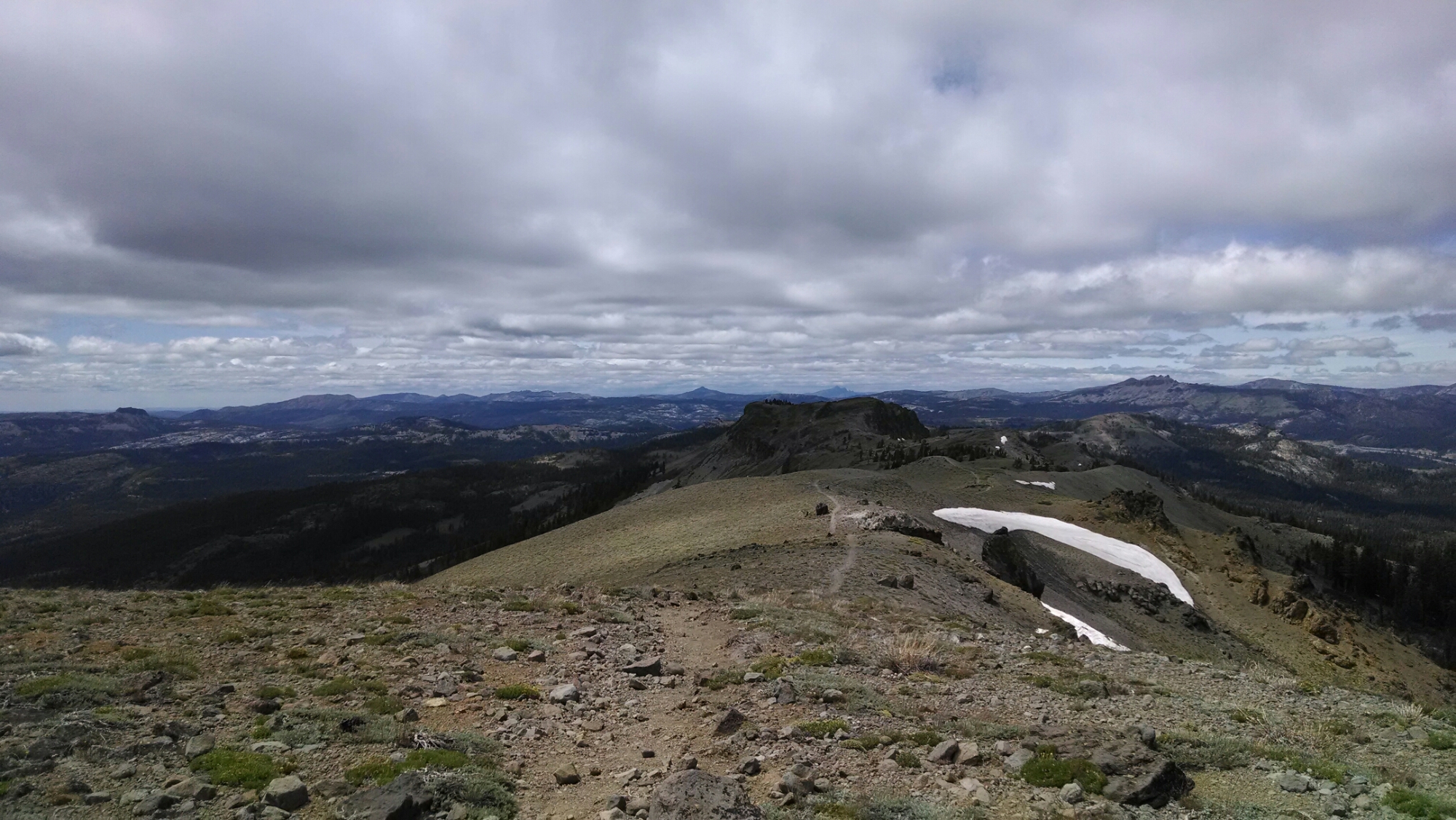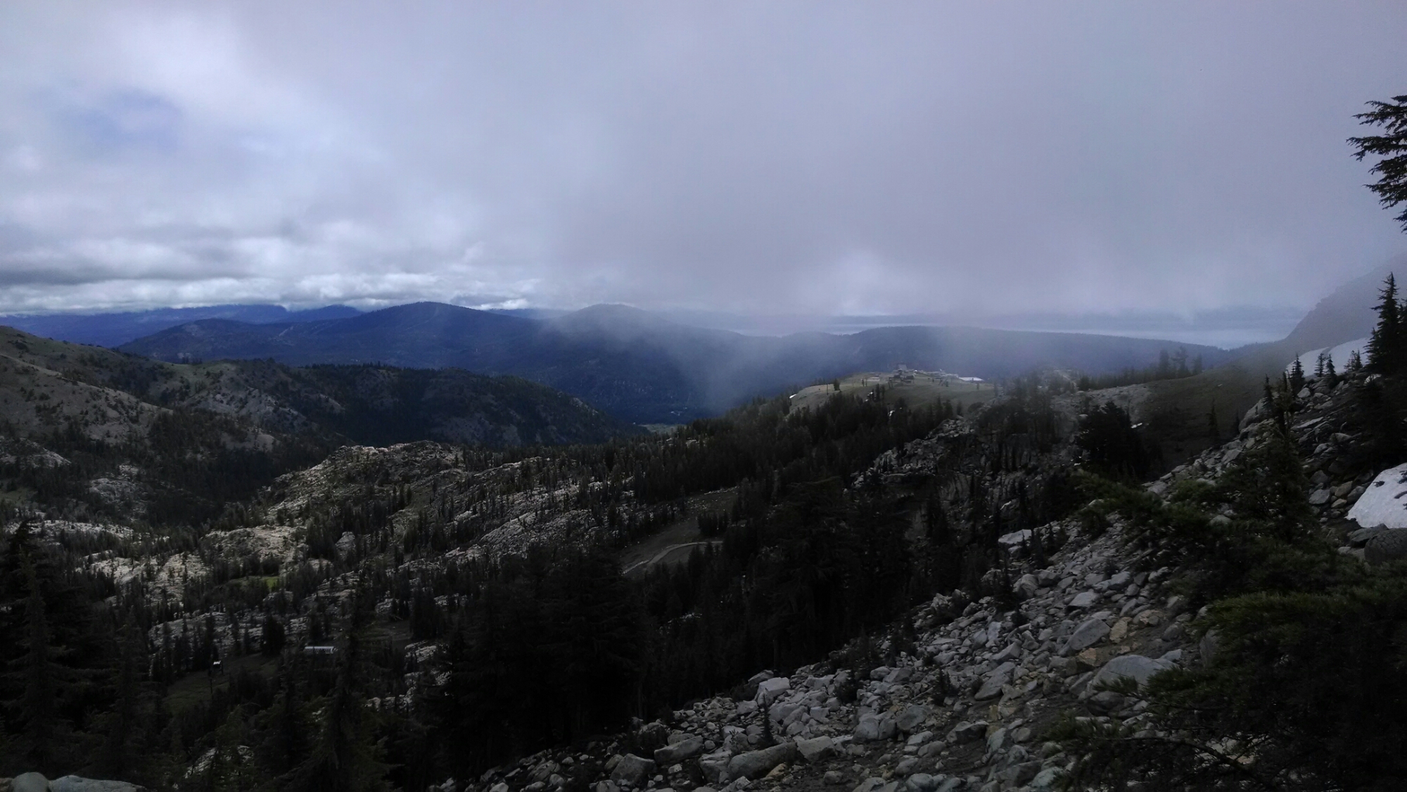 The wind howled all night as it rained periodically. The alarm goes off at 0530…it’s still raining, thus no reason to leave a perfectly dry tent, even if it is to slog our way into town, so back to sleep we go. We awake an hour or so later, and the rain is barely audible. It is only when the wins gusts that pellets of water blast the top of our tent. We reluctantly rise and begin to pack in tight quarters. Truckee will not come to us today, so we must exit our synthetic cave. When we exit, we are enclosed in the rain gear we have carried since Day One (with the exception of the week we left our rain gear at home to “reduce weight” and almost learned the hard way in Big Bear, that it is better to carry that kind of “weight”). It’s not so much as raining as it is misting. It appears that the cloud has actually parked itself in the valley and plans to linger, at least until we walk completely through and hopefully out of it. Pack covers to keep the contents of packs dry. Check. Rain pants and jackets to keep our bodies dry. Check. Galoshes to keep our feet dry and warm…ah, NO. Today we will be walking in personal puddles that refill all on their own with the help of water saturated vegetation we brush up against and our rain pants that ensure all water repelled from our pants funnels directly onto and through the mesh of our shoes. With each step water and bubbles ooze from the sides of our shoes. Walk ’em warm and walk ’em dry never had such a purposeful meaning. We walk through lush green vegetation and begin a slow climb out of the valley. We decide to invoke the “glass is half full” perspective and comment that were it not for the rain, we would definitely be fighting off hordes of flying piranhas. It may not be a silver lining, but aluminum will do. A large buck runs across our path in front of us. Cool. The sun teases us as it peaks out and shines on us in chaotic intervals as we climb higher toward the peaks of the Squaw Valley ski area. We eventually walk out of the wetness, but the sky continues to menace us with its dark and plentiful thunder clouds. Paul decides to tempt fate and changes out of his rain gear. I am noncommittal and remove the rain jacket that has, in all reality, outlived its usefulness (and needs to be replaced), but keep the rain pants on.
