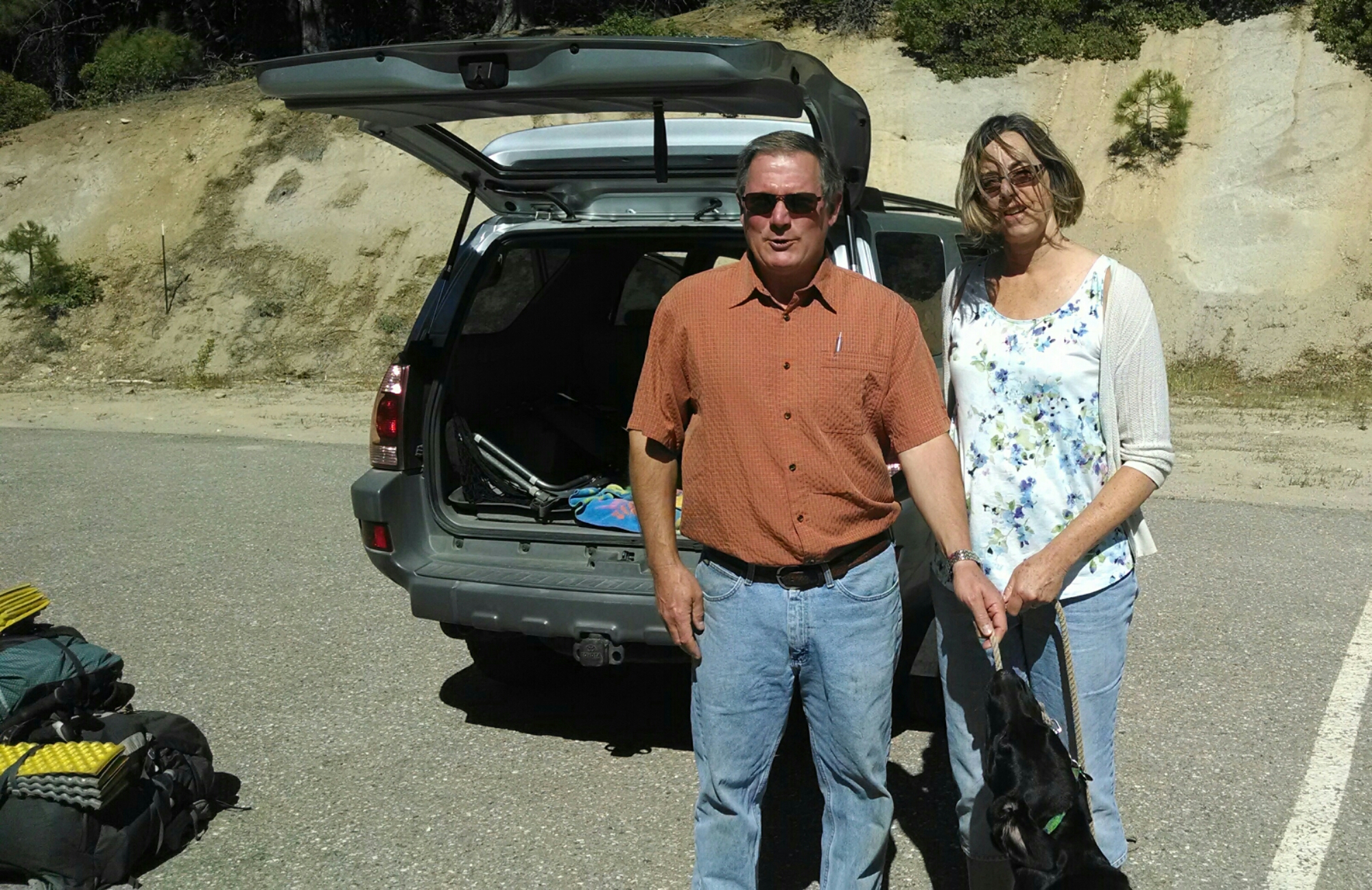 Just before we leave for the pancake breakfast another hiker, Tortuga arrives. Tortuga is our age and started from Campo one day after us, March 31. We talk about our travels and are amazed it’s taken over 1200 miles for us to cross paths. We have quite a bit in common. He and Paul have the same packs, shoes and very similar clothing. Tortuga has just retired from the Forest Service., and his son-in-law’s parents live in San Clemente. We head out to the pancake breakfast, packs in tow. Terry takes us by surprise and treats us to breakfast. Awesome. We are greeted by friendly smiles and comments congratulating us for getting this far on the PCT. There looks to be about 200 people in attendance, a raffle for gift baskets and assorted consumables is held. Buck Lake Fourth of July t-shirts were being sold (wish we would have bought one and mailed it home). Alas, it became time for us to leave this wonderfully relaxing hamlet, so we gather our gear and make one last pit stop before we attempt to hitch up the road to Buck’s Pass. Before Paul even gets his pack on he is approached by a couple who inquire as to whether he is hiking the PCT. Paul responds that he/we are. The couple, who is near about our age asks if we keep a blog, as they follow a few. Paul tells them our blog and low and behold ours is one they follow! We talk about some of our trail adventures and they asks us if we need a place to stay or a ride. We tell them a ride to the trailhead would be greatly appreciated. They pull their car around and we load up.