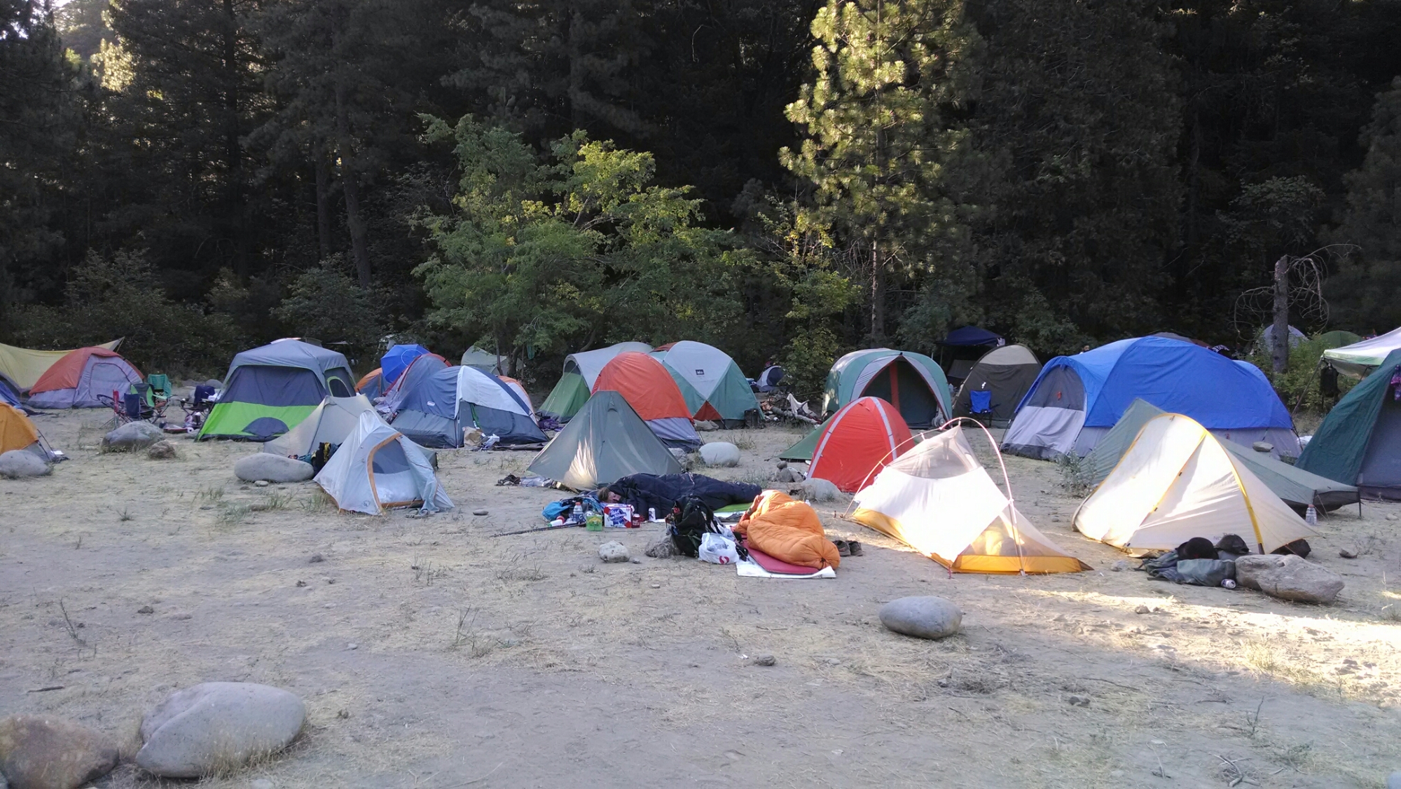 The trail was fairly easy with the exception of the 35 downhill switchbacks… of which I trip badly at switchback #4 (so much for staying “clean”). Near switchback #20-25 we start to hear music, techno bass music. We thought the rave party was supposed to he over. When we get to Belden Town Resort (the PCT goes right through the ” town”) we are greeted by costumed people with vacant eyes and liquid smiles…”welcome” they say, “enjoy”, ” stay a while, you’re just in time for the best part…it’s a space theme”. Hmm. Space theme. Appropriate. Everyone is in shiny, or dayglow colors. Some have interesting hairdos… like a blind monkey cut and colored their hair. We run into a few thru-hikers we know and they implore us to stay, at least for the experience and the extraordinary people watching, and direct us to the area they’ve set aside for the thru-hikers. As it’s late, we succumb to “peer pressure” and decide to stay, thus checking off another item from the “bucket list”. This was quite the experience. We were told by the shop keep at the resort store, that “Belden Town is what ever you want it to be. We don’t have law enforcement here, so we police ourselves, but if it gets too out of hand we’ll call CHP and walk the guy across the bridge to them.” Awesome, we reply. We purchase snacks and some beer, walk back to set up our tent amongst the other hiker trash.