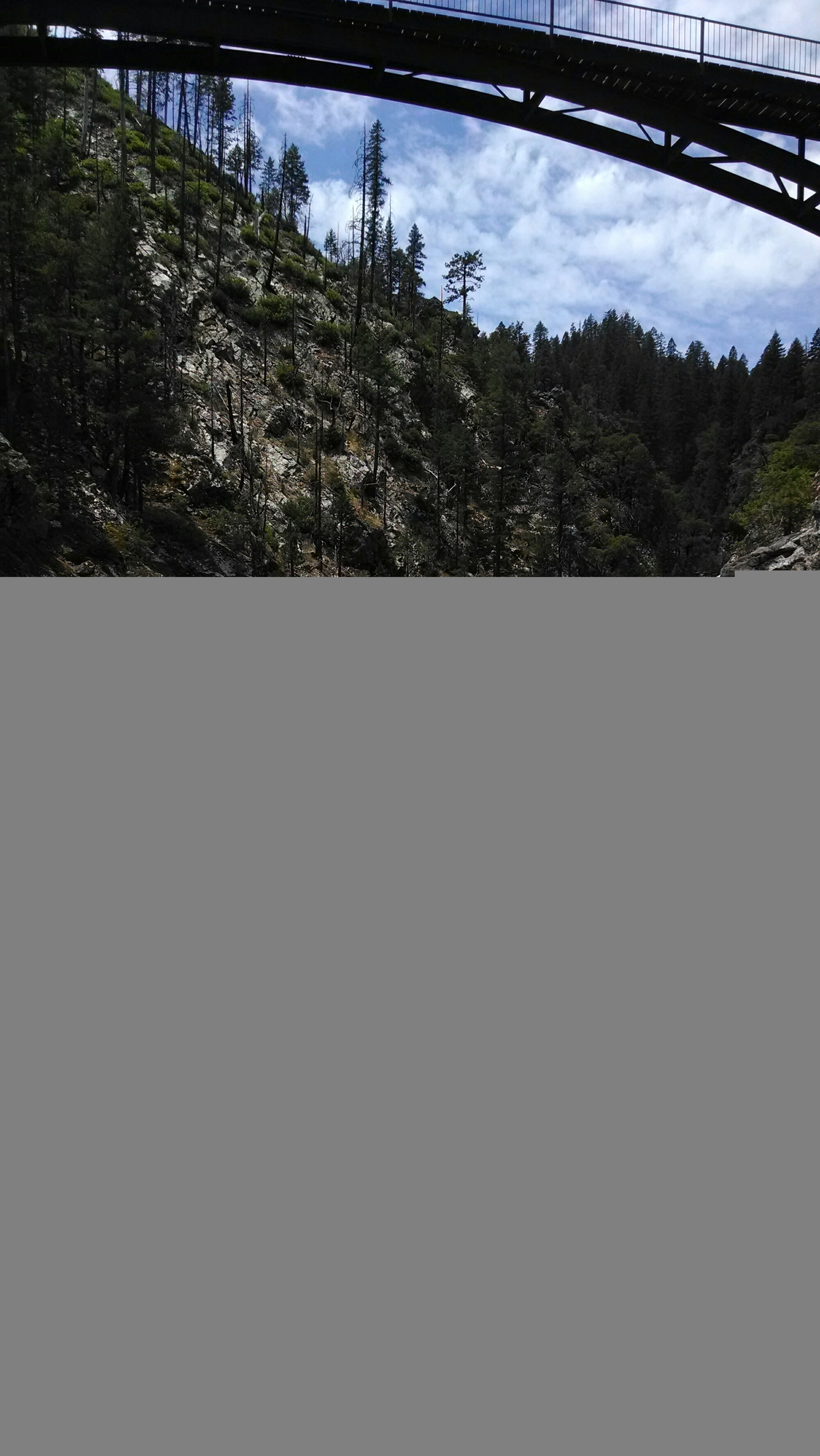 We awoke to predators outside our tent, buzzing, lying in wait, ready to pounce the moment the tent zipper was parted. We hastily consumed our breakfast, battled the skeeters and flies, and were off. We are so excited because today we should be able to swim in the Feather River. It’s going to be hot again today and dip in the river should be glorious considering how warm the air was when awoke up at 5:30. Small climbs and drops along the dry 10 miles and then a very steep down to Feather River were on the menu for the first half of the day. My knee gave me a reminder that it hadn’t voted to do this hike in the first place. Before reaching the bottom I had to rest. Paul had been leading most of the morning so I had to “race” forward to catch him so we could stop. After a 10 minutes rest I was ready and took the lead. By now we could hear the rapids of the churning river. I walked no more than 50 feet from our rest stop and was about to turn toward Paul to remind him that I think we’re in snake territory again, when a 2 foot rattlesnake on the downhill edge of the trail to my left within a foot of mine, brakes out in song and slithers off the trail and a couple feet down the hillside. Of course I freak and muscle memory takes over. I moon walk, run in place, and stutter… s n a k e!!! and turn into Paul who is directly behind me. We collide as he pushes me forward and it’s everything I can do not to climb over the top of him, just to hey behind him. Flashbacks from the desert race through my mind. Paul laughs and reminds me my trail name should be “Rattles”. Paul, is now back on point, and we arrive safely at the Feather River with no further slithering reptile encounters. A large metal bridge high above the water makes for an easy crossing. We wonder aloud what something like this cost to build and how they got it here. We cross the bridge and make our way down to the bounding river’s edge.