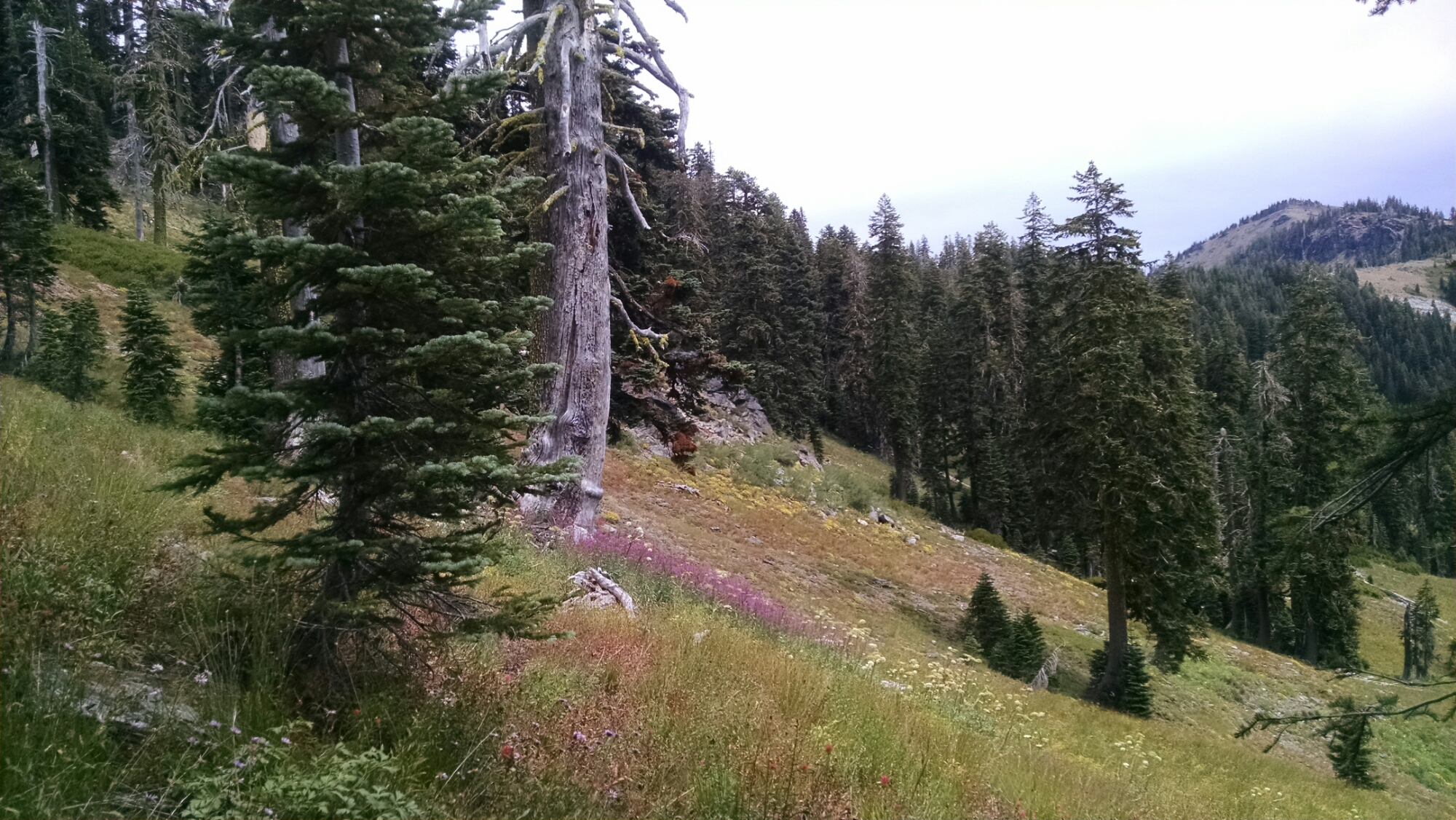 The trail skirted the the base of the mountain with dribbles of white and eventually black marble boulders and stones peaking through dense green and flowering vegetation. Water was plentiful and when we stopped for a snack and to water up, two chipmunks dazzled us with their MMA skills and several does walked by completely unfazed by our presence.