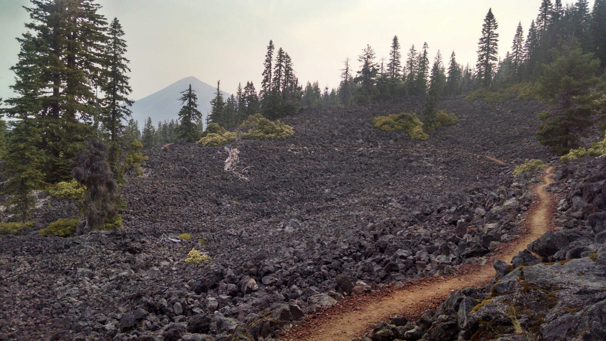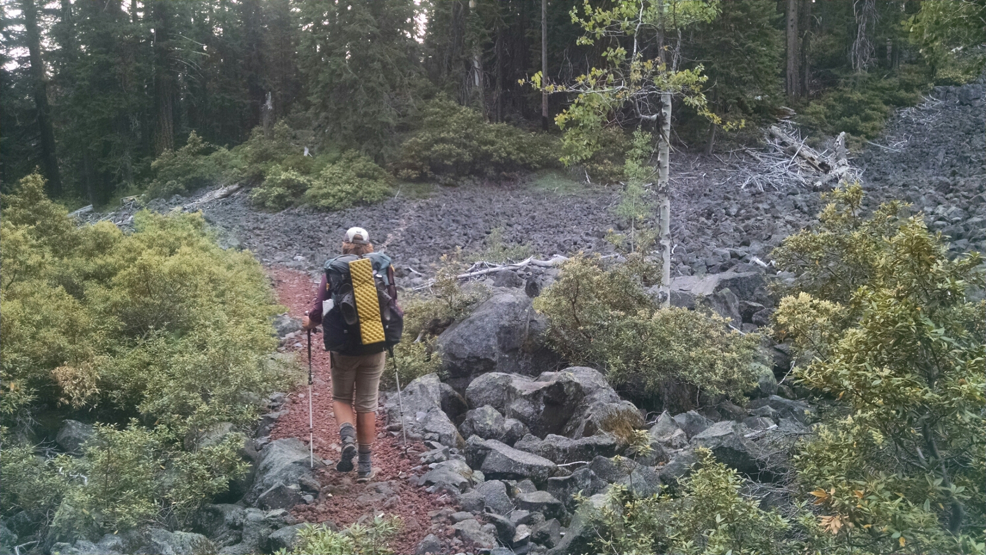We traversed along a forest trail and emerge out into a lava field. Large black lava boulders surround the trail. Small red lava rock lines the trail tread. This is a new look for us, something we haven’t seen in over 1700 + miles. As we walked between the large rocks we could feel the day’s heat radiate on our legs. Lucky for us the evening temperature had begone to drop and the radiant heat was tolerable. Now to find a campsite in this rock quarry. Just before dark we find a nice flat spot between rocks and forest and camp.