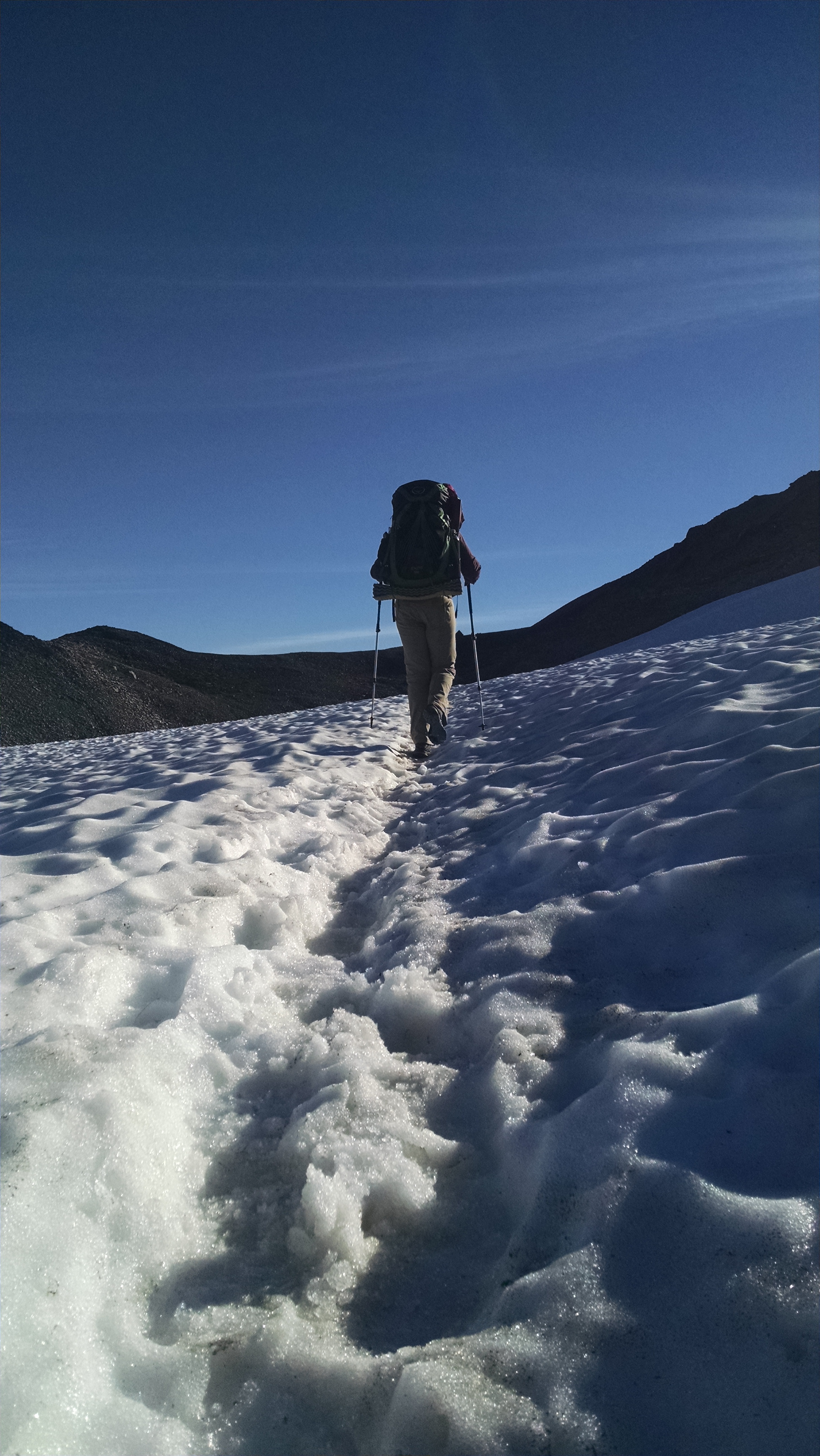 But wait, there’s more…we also traverse through frozen icy snow…another fave. Without our trekking poles it would have been very difficult to safely cross this slippery junction, and near impossible for me to make it across. We watched as another hiker, just ahead of us, without poles finally just sat down on his butt and slid across the snow by paddling with his hands. A mistake here could result in a fall of a thousand feet. As I’m not great with heights this wasn’t a lot of fun for me.