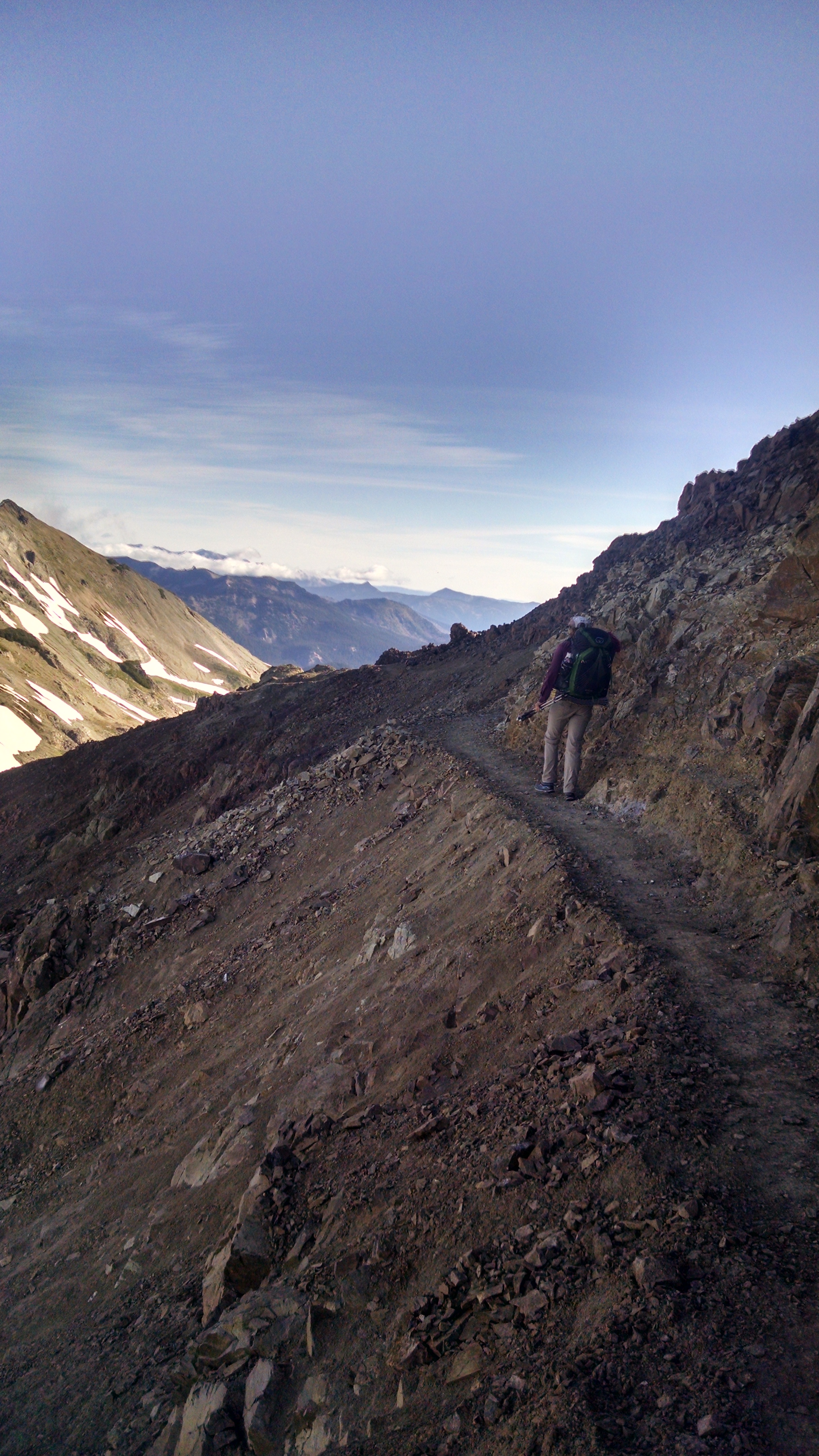 It is covered with snow, towering into the sky, and oh wow! amazing. The trail traversed along a very steep mountain face of slip shale rock, which I enjoy so much.