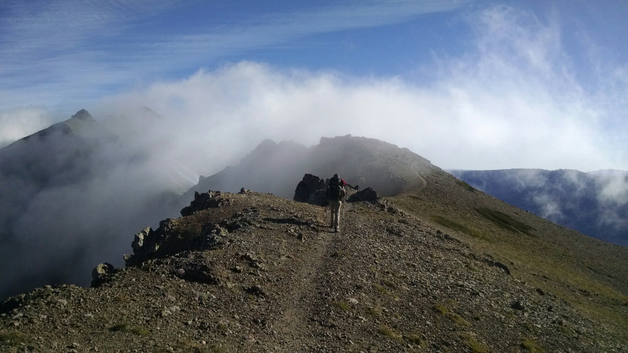 The views, however, were breath taking when I took the time to stop and look around. Paul of course had no problem, and probably walked with his poles in his right hand and his left hand in his pocket, without a worry in the world, as he often does during downhill jaunts. We had nearly finished crossing the Knife’s Edge, and onto a wider based trail, when a low cloud descended on top of us.