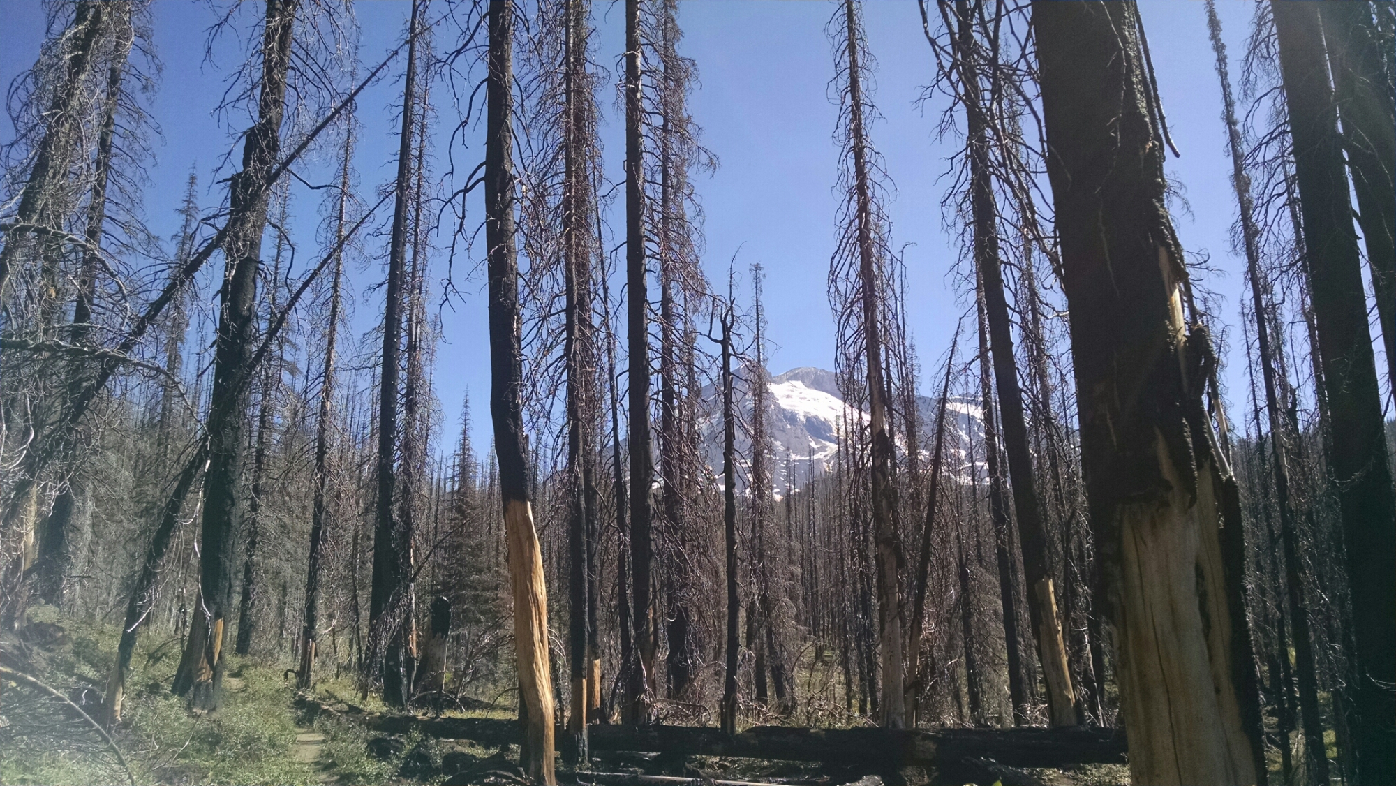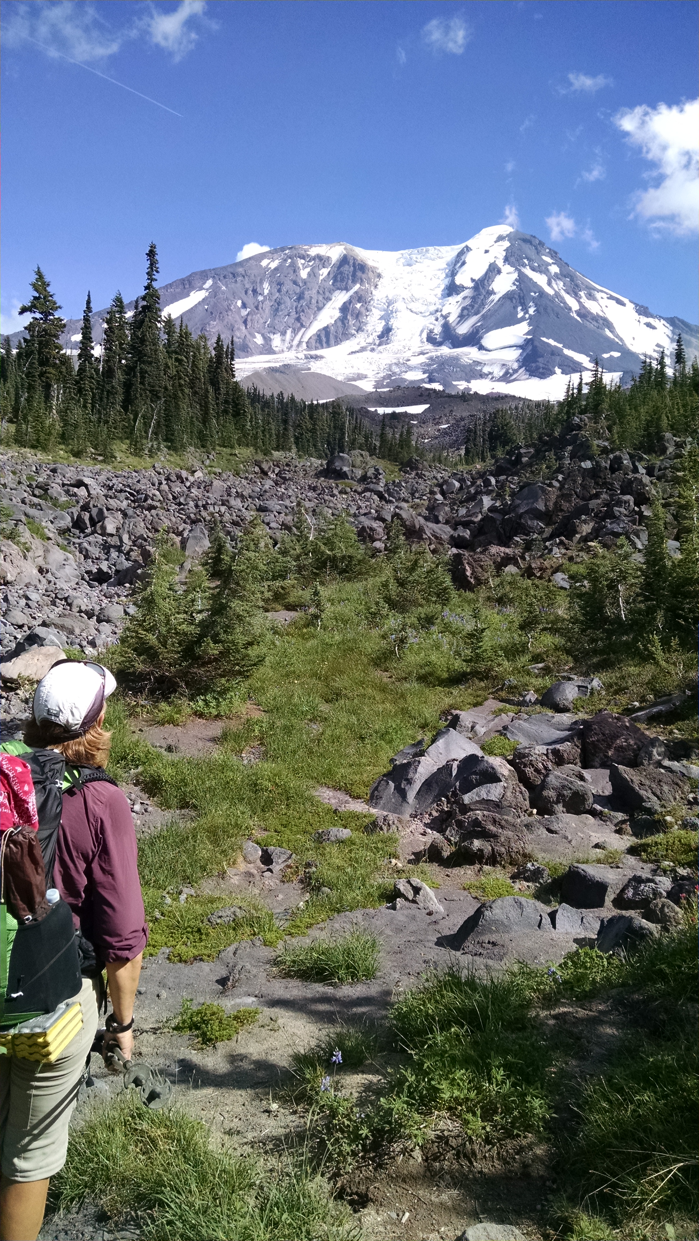 We ascended through a burnt forest and exited into volcanic rock and a spectacular view of Mt. Adams, which up to now was blurred by the burnt forest.