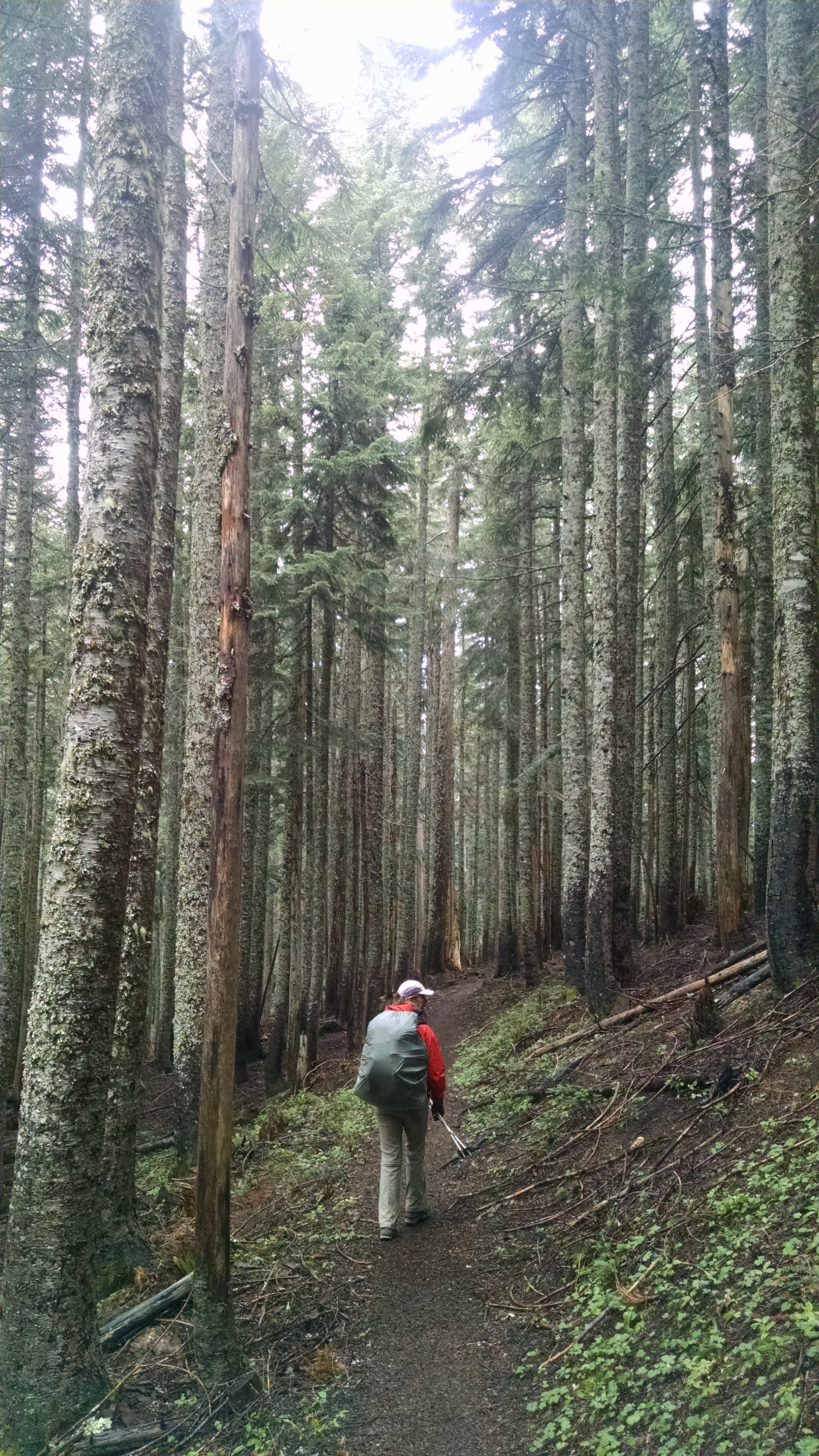 Onward we slogged, soaked inside and out. The wind howled, the cloud that sat upon us continued to spit rain. Water spurted from almost every rock crevice. Our feet squished as we walked. At least they’ll be clean we mused. Even though we were miserably wet and cold, we made good time. After most of the morning spent shuffling through the rain and mist, it started to “clear” up, and the sky no longer leaked “liquid sunshine”. This does not mean however, it was dry by any means. On a downhill traverse, deep in the forest, I took a hard fall when my feet came out from under me after I inadvertently and unintentionally stepped on a wide, slick, log. While I saw the log, and recognized it was slick, somewhere the message from my eyes to my brain to my feet of, ‘Don’t step on that log’, must have, by the time it reached my feet somehow lost the “don’t” part. I went down so fast and hard, Paul was sure I had broken something, most likely my hip.
