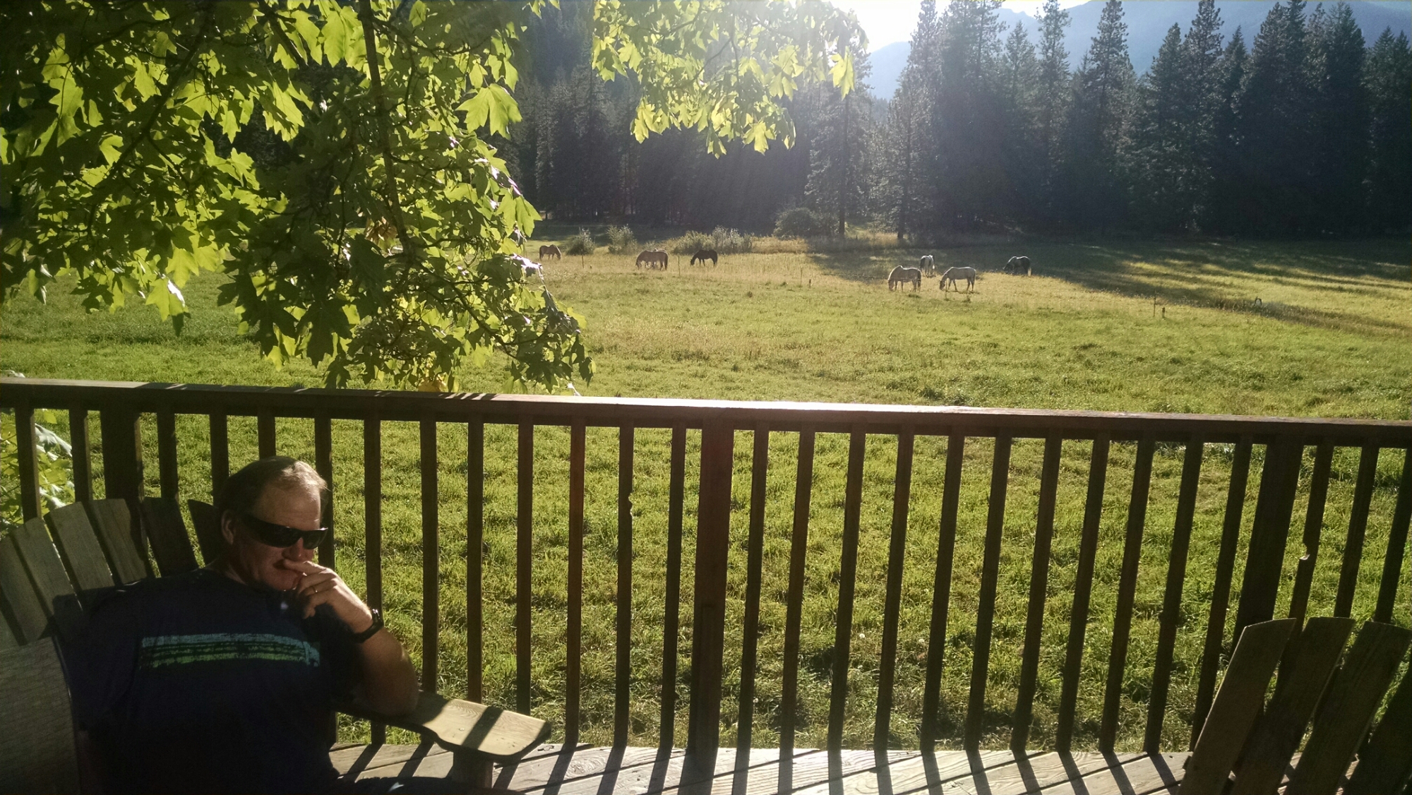 After making ourselves fragrance free, and while waiting for our laundered items to line dry in the fresh air, we park on the deck and sip a beverage before dinner. Here we formally meet the ladies we were talking with on the bus. They are all nurses, or work in the medical field and are on their annual vacation/gathering at the Ranch. They live locally and have all done a two day backpack trip into the Ranch. We talk and laugh, and they fill us in on the workings of the Ranch and the local area. They are excited for us that we are almost done. We tell them that we will make one more stop at Rainy Pass for a nero in Winthrop with Vicky and Larry. Turns out that some of them actually know Vicky and Larry, and tell us we are “lucky”, as they are great people. Once again, the world shrinks a little bit more.