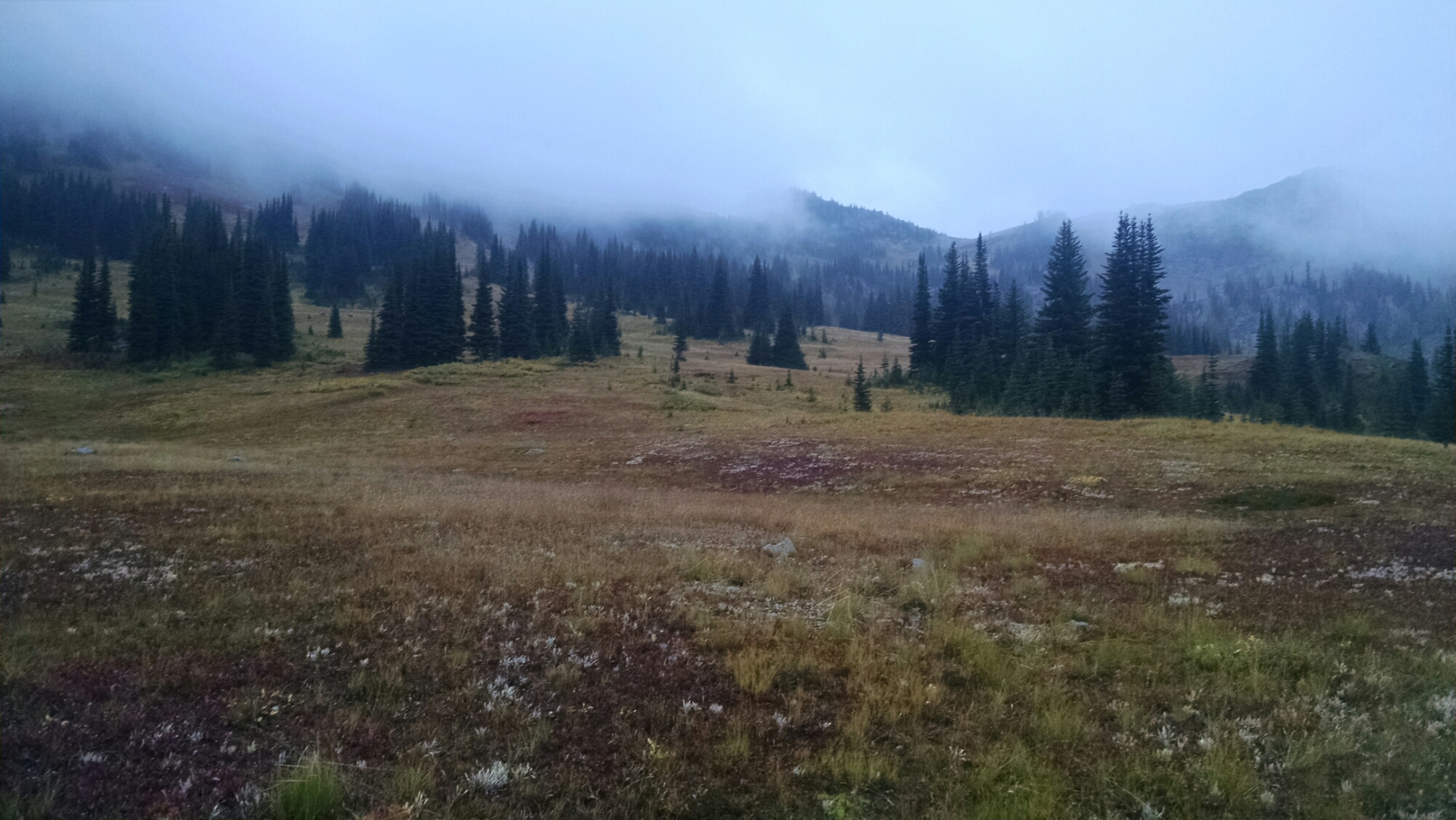 The patter of big fat rain drops continued throughout the night. Only the cadence would change. Thinking that I could take advantage of the non-stop rain, I had put my metal cup outside the rainfly to catch the run-off from the fly for additional water the next morning. As we had retired relatively late last night after having completed the better part of a marathon, no morning alarm was set. We awoke near 7am with the sound of rain still striking our tent. Grrrr! Once again, we muse, it could be snowing. Decision time. “Wait” out the rain and hope it doesn’t morph into snow, or pack it up and brave the cold and wet…one last time. Things you don’t want to do are best done, first and as quickly and efficiently as possible. With that, our decision is made. Pack it up. At minimum, we will be to the monument by 2pm, and Manning Park no later than 8pm. Again, this is not how we envisioned our last day on the trail, walking in another leaky cloud, but as always, it is what it is…nothing we can do about the weather.