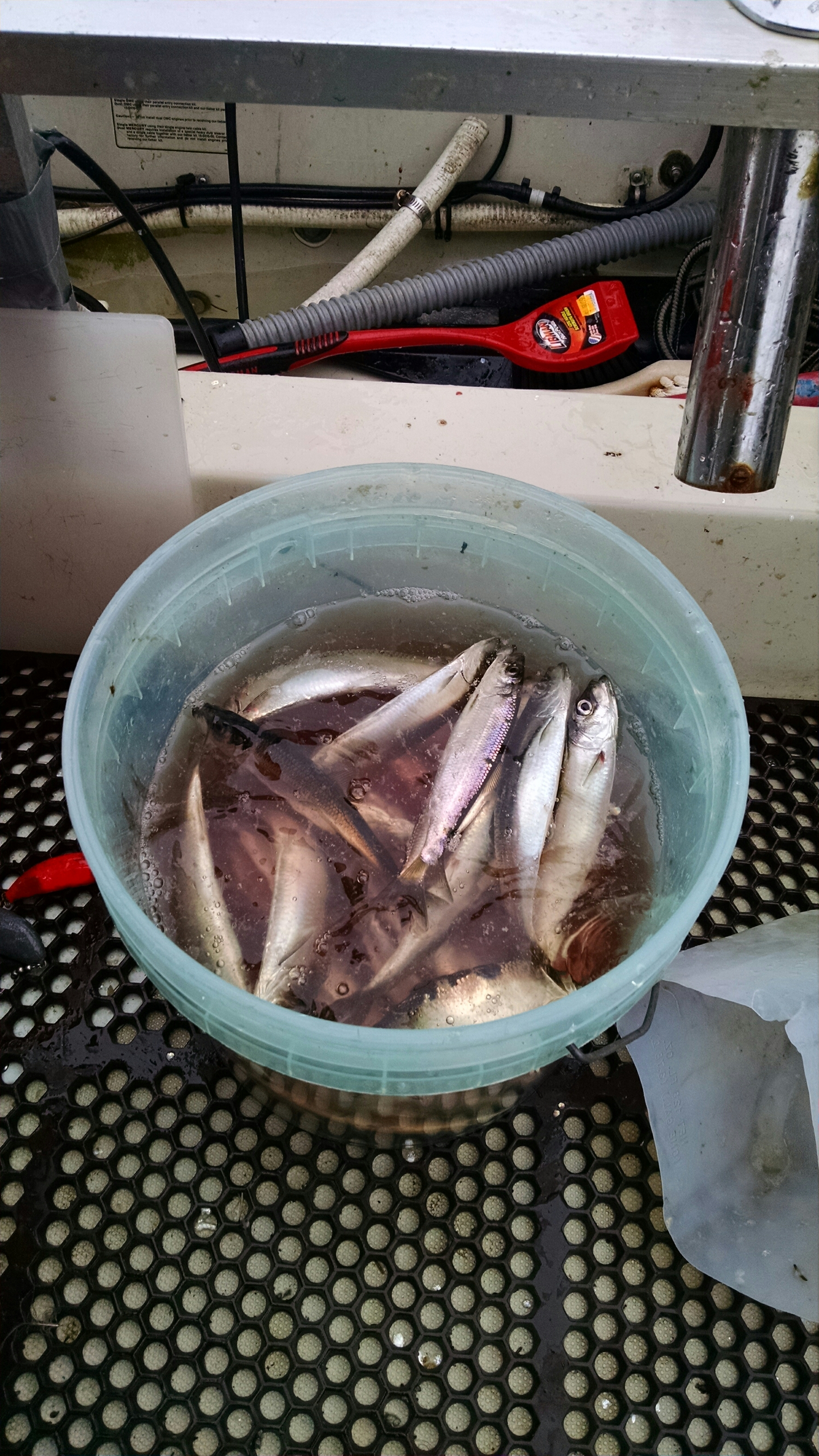 Once the bucket was full “enough” it was non-stop action, initially of the Humpy variety. The Humpys are passive aggressive fish and would gladly allow us to net them (rather than shake themselves off or allow us the honors), and then do an alligator death roll in the net as one of us had another fish on and needed the net. At one point we had landed a fish, had another on and realized no one was driving the boat in 3′ seas. Ooops. After a while we settled into a rhythm and functioned like a well oiled machine. At the tidal change we found the bait and the the Silver bite was on. I dare say however, we lost twice as many Silvers as we landed, and caught easily double that in good sized Pinks that we released. Two King (Chinook) salmon found their way onto my line, but they were just shy of legal and had to be released. My son had another hog of a Silver that again just didn’t want to get in the boat. They say ‘three’s a charm’, so maybe tomorrow will be his lucky day.