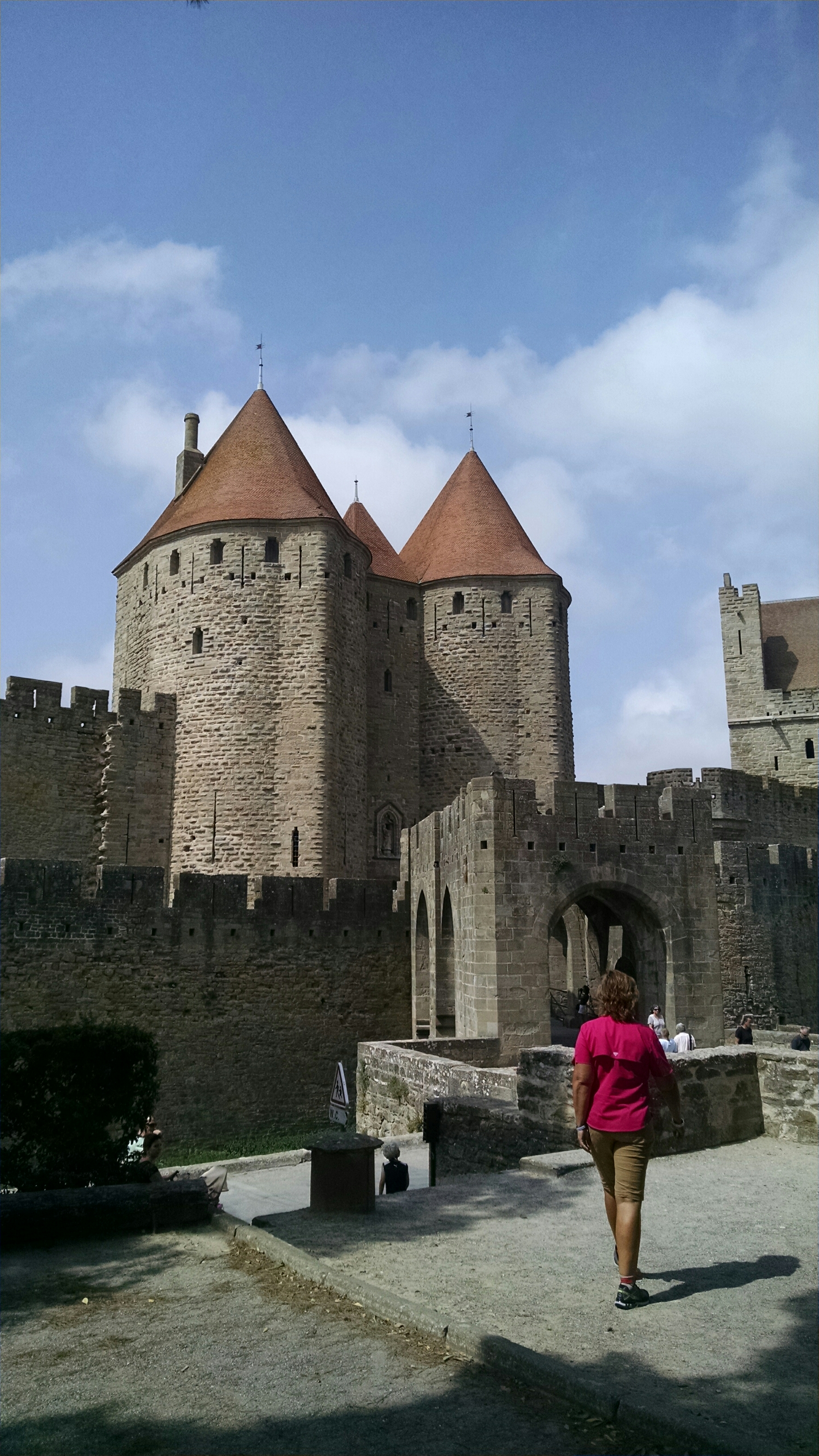 This morning we are off to Carcassonne, a restored medieval town on the UNESCO list (whc.UNESCO.org/en/list/345 ). First stop however is the Hertz office at the train station for some help resetting our GPS. The attendant at Hertz told us there were two ways to fix it; either he teaches me french really quick, or he attempts to change the language on the device for us. He has some difficulty navigating the device (and he speaks French), but eventually is able to change it to English with a British accent…good enough. Off to Carcassonne we go on a similar but different version of yesterday’s “Mr. Toad’s Wild Ride”. The streets are narrow and the other drivers are impatient. We are now glad we got the extra collision insurance as we are not all that confident we will be able to turn the car in, unscathed. Once out of downtown Toulouse, which reminds me of a combination of San Francisco (without the hills) and New Orleans, we are flanked on either side of the highway with vast rolling fields of sunflowers and/or vineyards. Traffic moves at fast and flowing pace and we learn quickly (sort of) that a vehicle behind you with a left turn signal blinking (and there’s no left turn to be made) means “Hey Stupid, Get Out of the Way!”