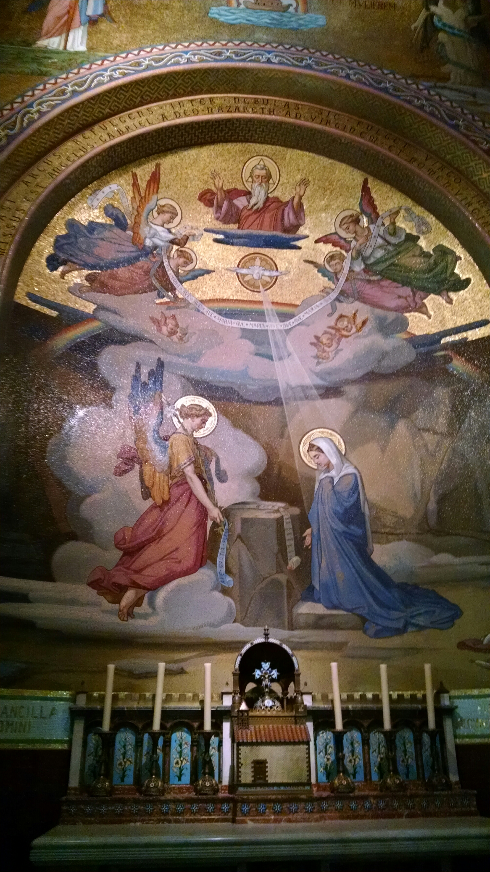 as we view the intricate stained glass and mosaics that adorn the interior of the churches and Basilicas we tour; as we walk in the evening’s procession; as I sit waiting patiently for my opportunity to “bathe”, if only for a moment, in the healing spring water;
