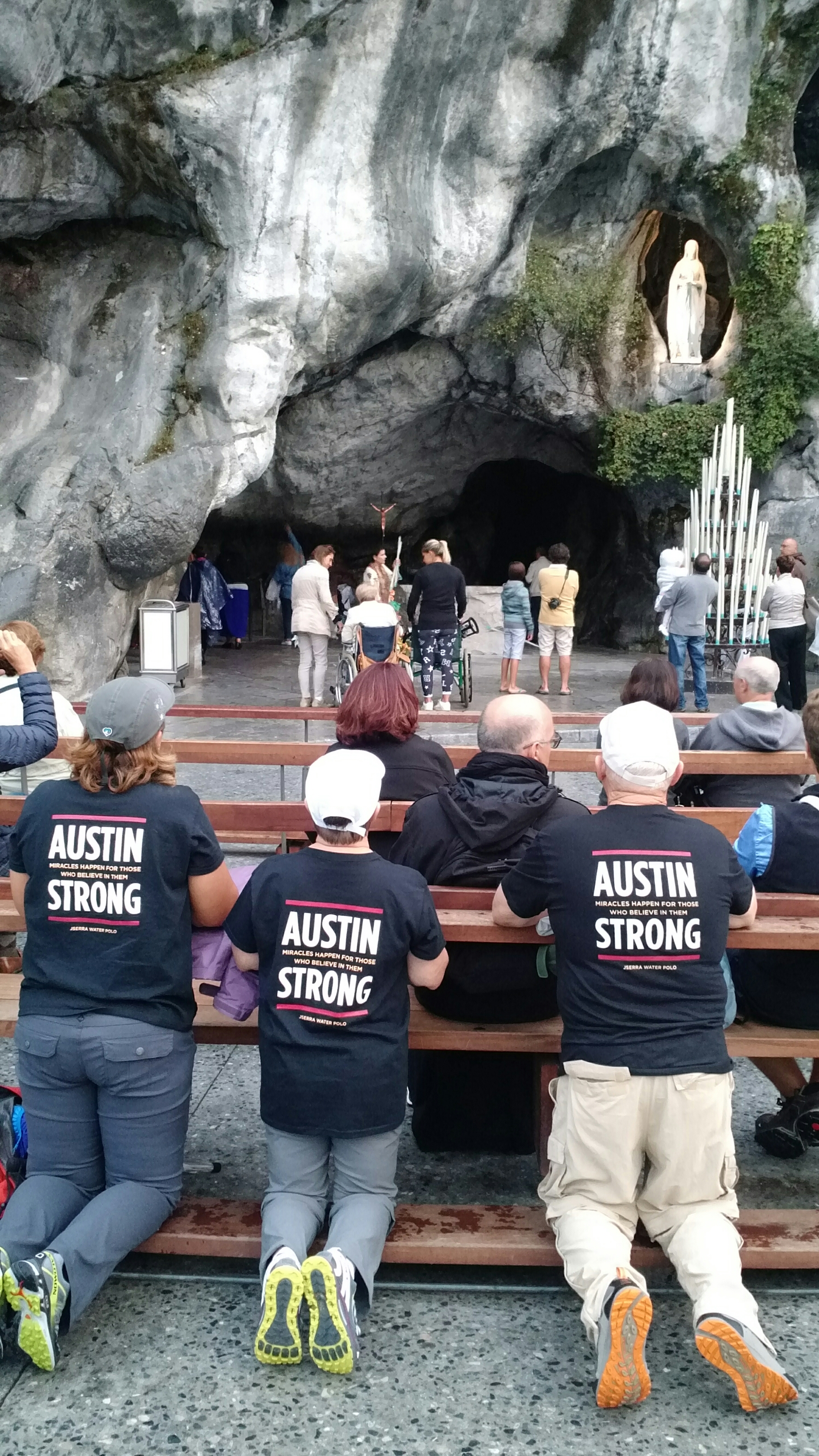 Being at Lourdes for the beginning of our Camino holds a special significance for Paul, Sue and Jerry having been raised Catholic. For me, it’s purpose, intention and design has evolved somewhat, for two reasons. One because my beautiful daughter suffers from fibromyalgia, and two, because at the start of our summer league of which I am an assistant coach for the JSerra Catholic High School Boy’s water polo team, we learned that one of our fine young men (just barely 15 yrs old) broke his neck while vacationing in Florida upon unknowingly diving into shallow water. His injury left him paralyzed from the chest down. It was unclear initially as to whether he would survive and/or ever regain any useful motion. This young man (Austin Brotman) and his family however, are strong of spirit and faith. Our Boy’s water polo team and the community of JSerra immediately rallied with prayers, well wishes and words of encouragement. As Austin was always known for never missing an opportunity to flex his muscles and show how strong he was, we coined the slogan of “Be Strong! Austin Strong!” as a battle cry. The boys have taken it on as a means in which to push through their gruelling workouts, figuring that this was nothing compared to the work and determination that Austin must and is enduring. Not a whimper, not a complaint was uttered. Some pushed to and through point of injury not wanting to betray the inspiration that Austin has brought to the team.