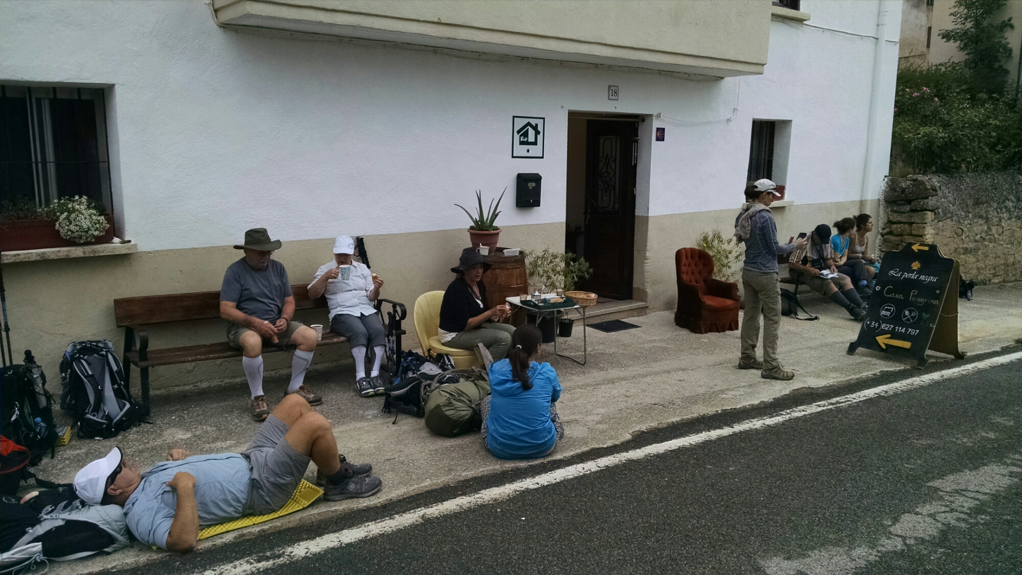 We reach a hilltop hamlet (Villamayor de Monjardína) and find all the “bars” closed, but not to worry as a kind man has stepped up and has provided “gratis” fresh coffee, tea and cookies for the pelegrinos. We leave a sizeable donation, so that he may continue this Camino “trail magic”.