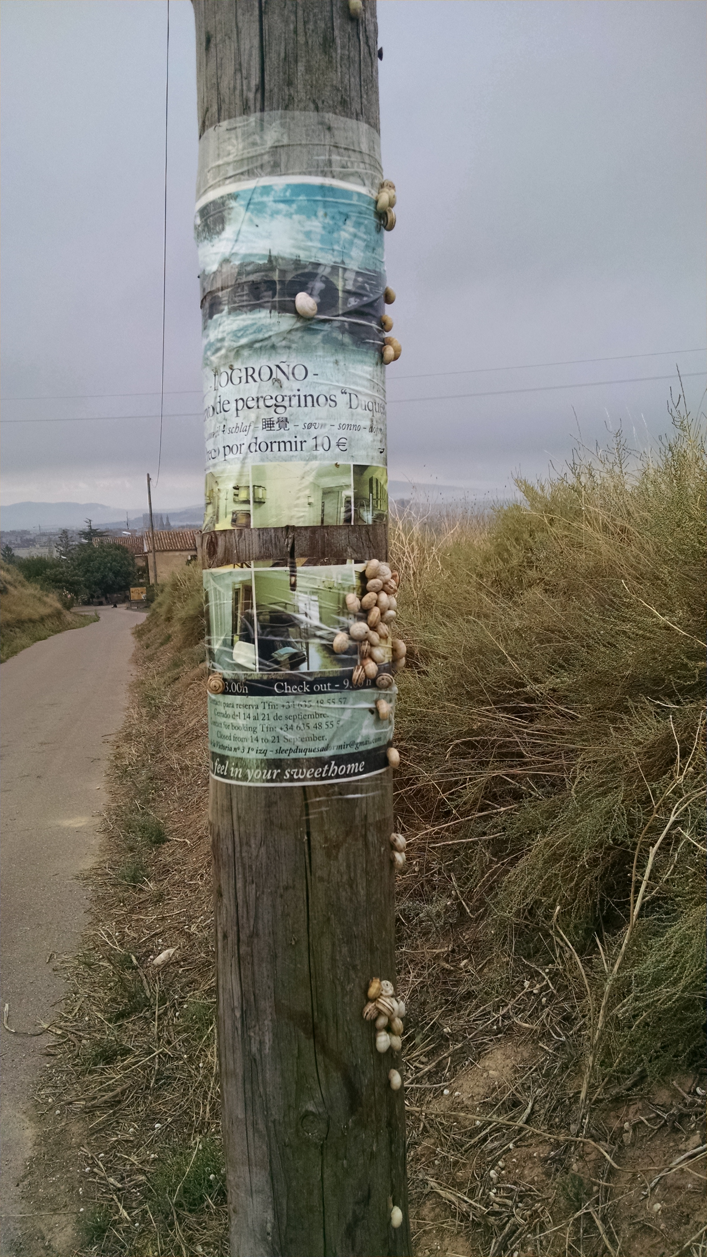 It is weird walking into a city after traversing mostly through countryside and small “sleepy” villages. Lograño, however is WIDE awake and I feel like we’ve walked into a giant ant farm. We breakfast at a corner café next to a roundabout. We chuckle as disoriented pelegrinos look at us and ask US for directions. Go figure. Sherrie pulls in sans backpack (she shipped it ahead to give her knees a break, per our suggestion) and has a bite and a chocolate with us. She tells us her feet (still blistered) and knees are feeling much better when not lugging around 18kg (40 lbs). Since we are in a big city, we figure this is the best place to look for an additional USB micro cord, and send Sue and Jerry ahead telling them that we will “catch up”. I think I understood the directions given by a helpful shop keeper and we peel off just prior to the Camino turning into a giant park (think NY Central Park), to find the Spanish equivalent of our Radio Shack. Numerous locals whistle, yell to get our attention and point in the opposite direction, obviously distressed that we are veering off the Camino and risk getting ” lost” in the big city. We assure the locals as best we can and find our store. Back on the trail we walk through the park.