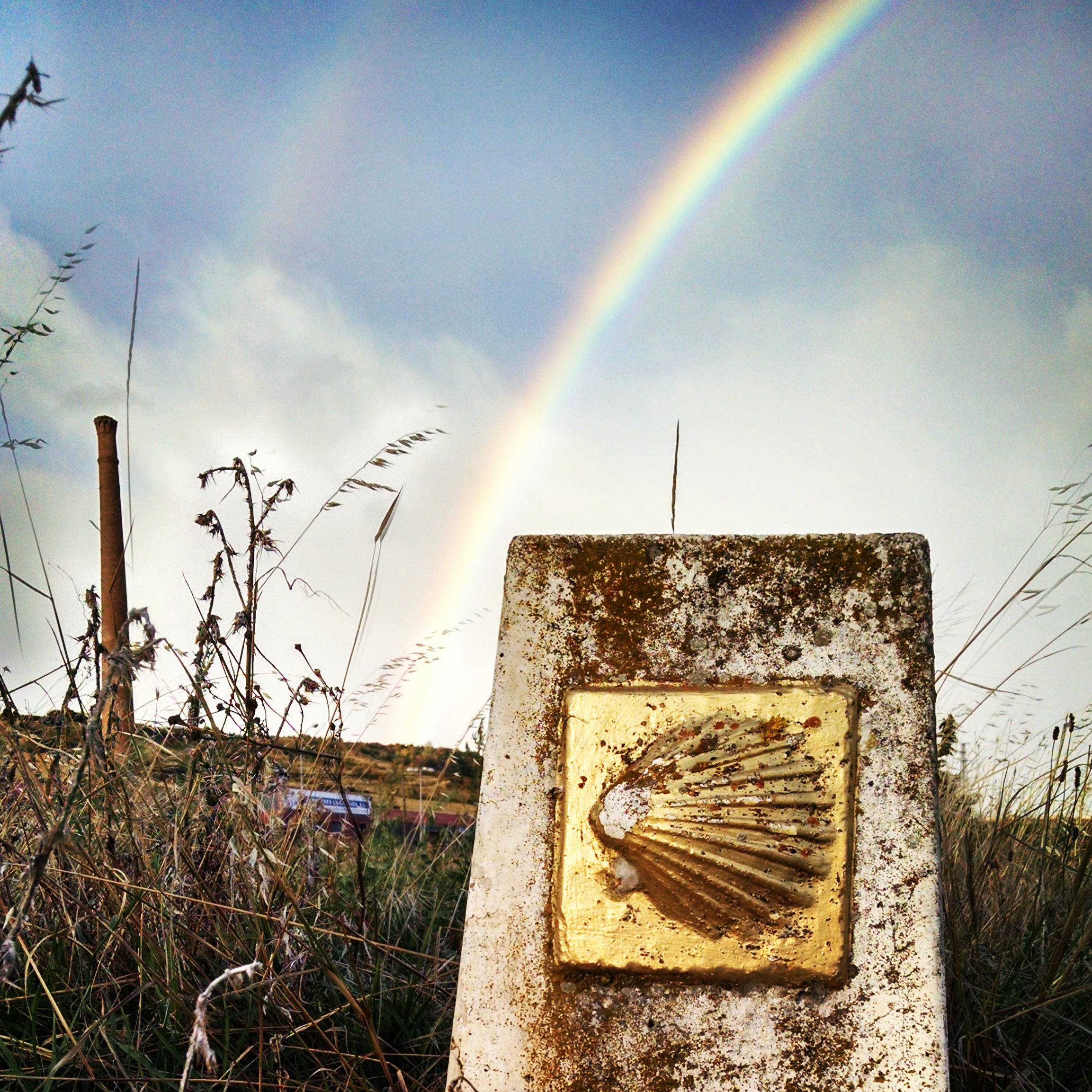It is COLD, but the forecast calls is “iffy” on rain. We hope the “iffy” is in our favor. As we walk out of town, the wind is gusting, so much so that has it not been for the railing on the bridge I would have been blown off and swimming in 3 ft of water. The skies are foreboding but we are treated to a brilliant rainbow.