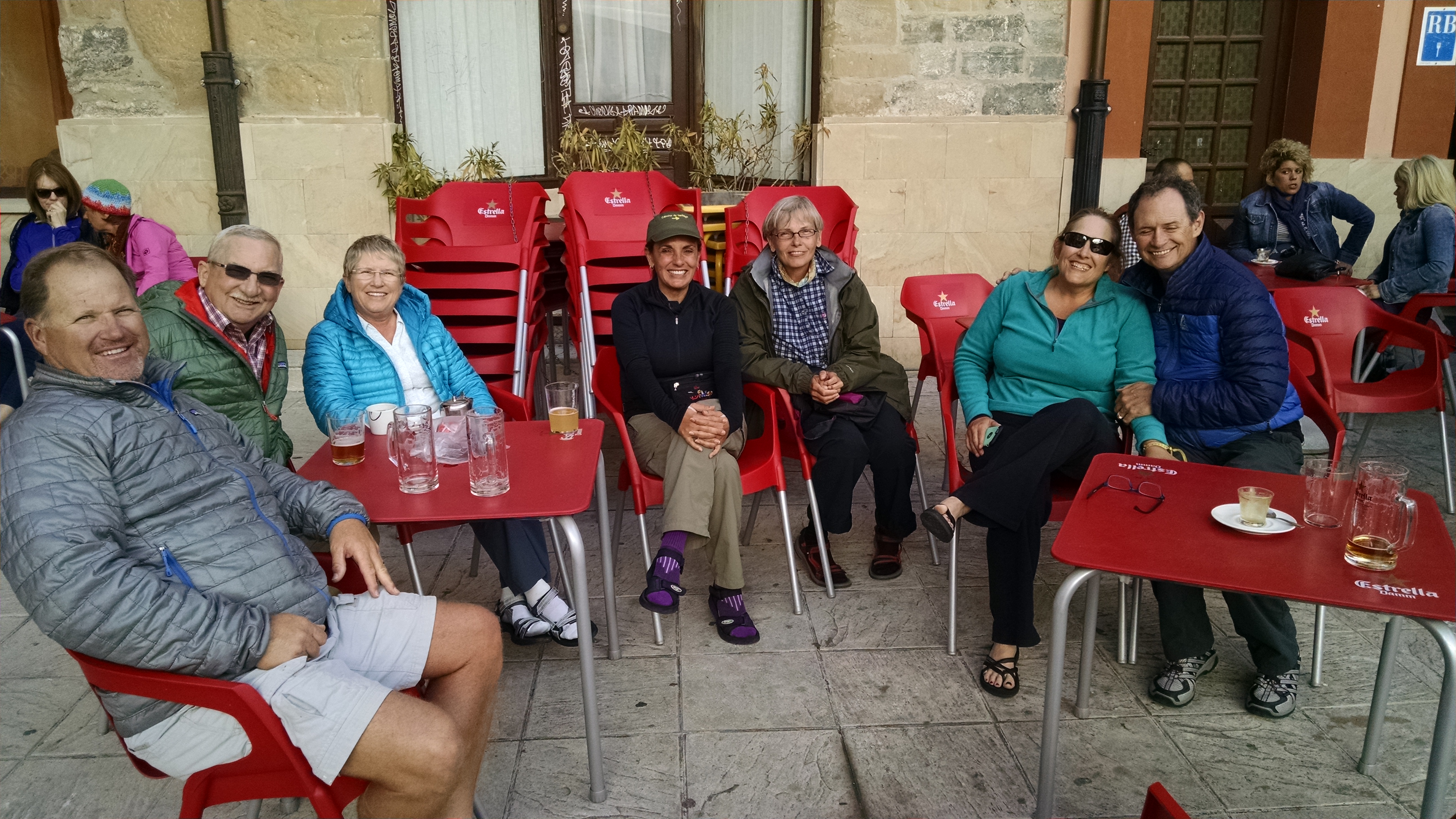 We have made reservations, and after a bit of wandering through the town of Belorado, we find out Bavarian Esq albergue. Our bunk room is on the top floor with a sagging yet stable thick beamed white plastered roof. We dry our clothes and shoes on the roof and wander back into town in search of a market for tomorrow’s lunch…and a tall beer. We find both, and Melie (from Florida) and catch up.