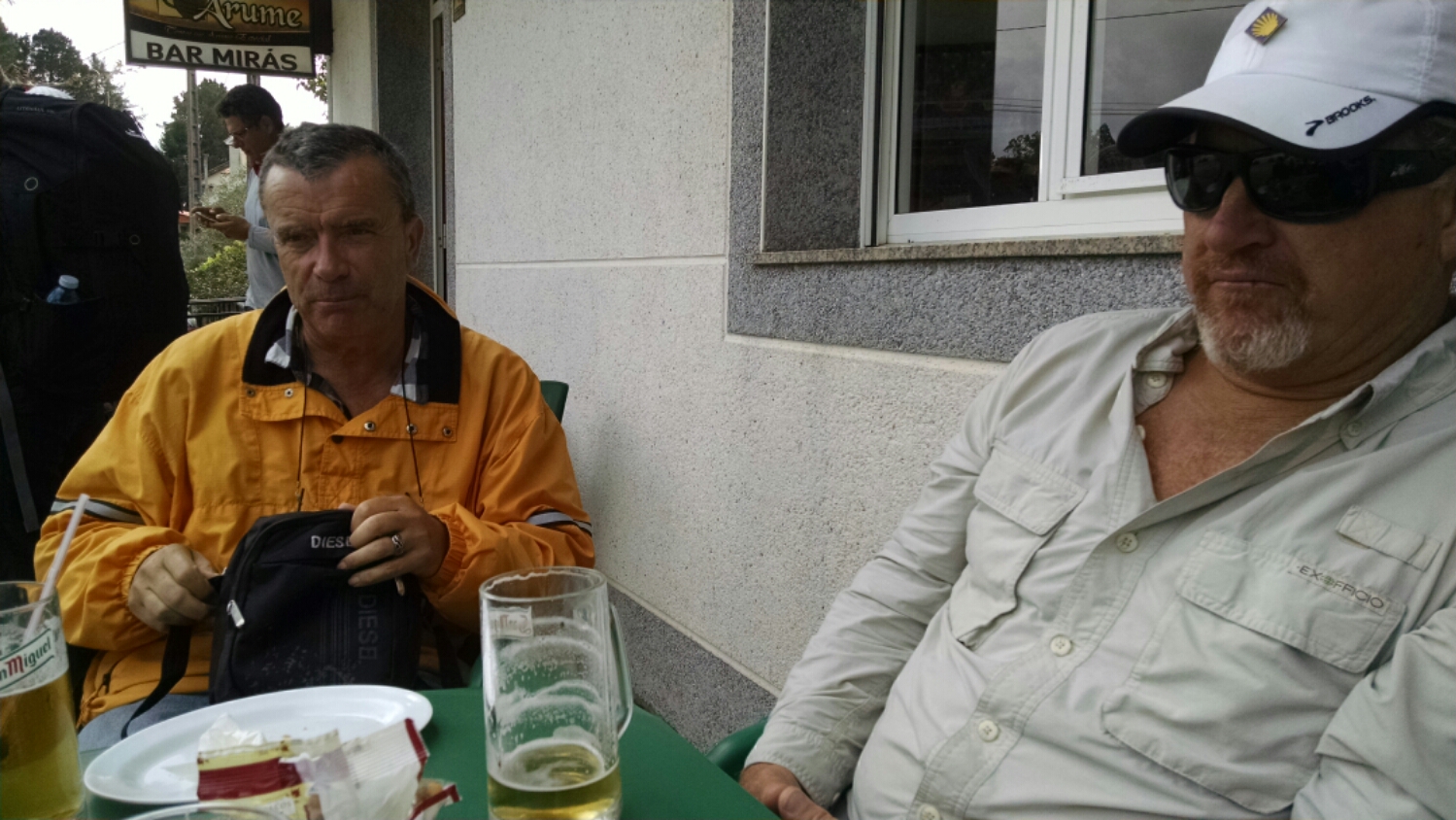 We make a “lunch” stop for our signature jamon y queso bocadillos (dry) and grande cervesas, just outside of O Pedrouzo, where most people “lay up” with 19.8km left to Santiago.