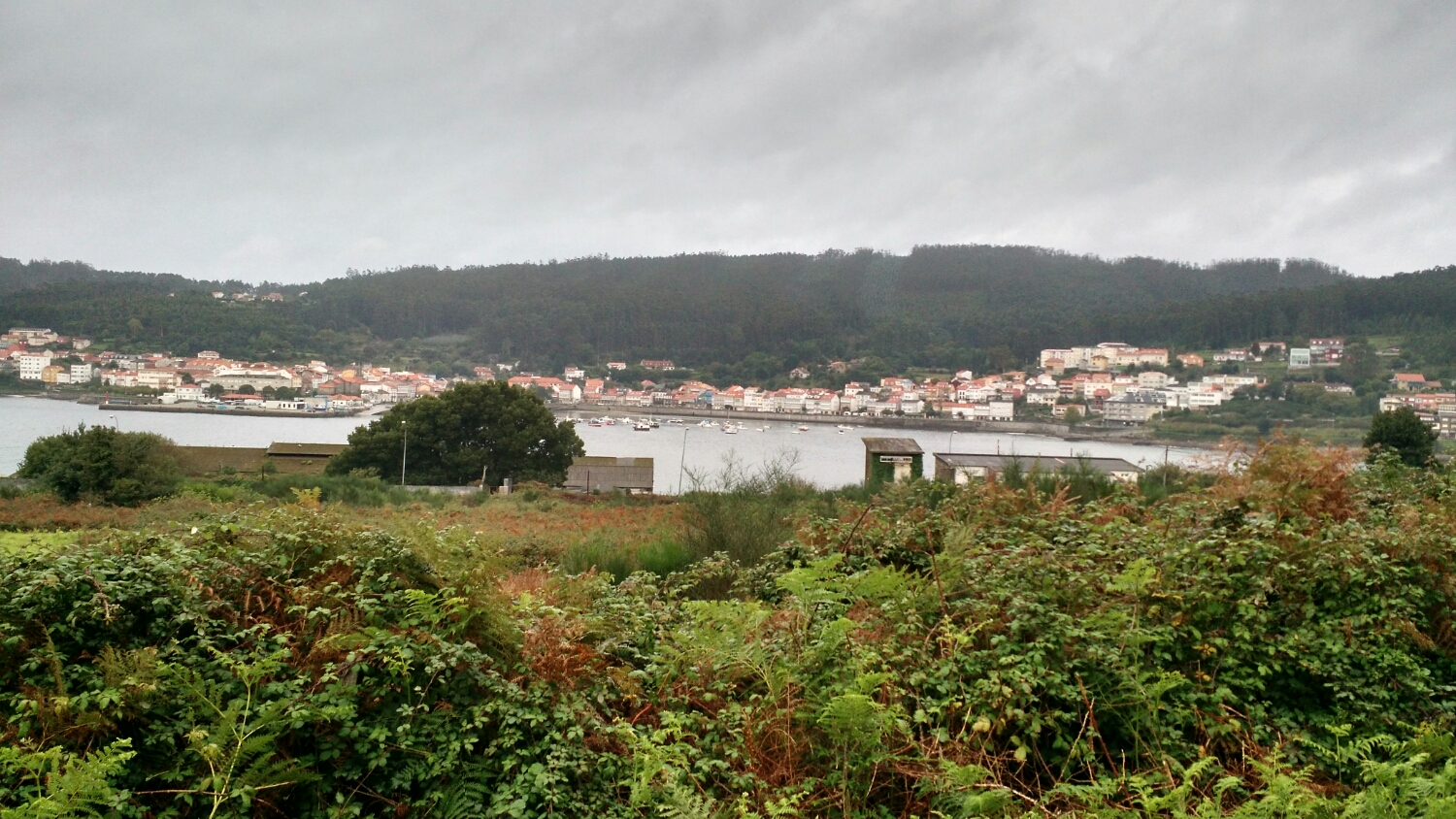 We spy a giant metal structure in the far distance atop a steep mountain and wonder what it might be, thinking that we will never find out, as surely we aren’t headed “that way”. Funny thing is, and we should know this by now, that when we spy a distant object at the top of a mountain, or path we’d rather avoid, we end up walking that path and/or at the foot of the object. This was no different, for when we turn a “corner” we find ourselves at the top of said mountain and at the foot of said object. We joke that it is probably a billboard for an albergue in the city of Cee. Today was an all or nothing day. Once we pass Olveira, there is pretty much nothing inbetween before we reach Cee. We are through Olveira realtively “early”, and the rain has been mild, so we roll the dice and continue to Cee.