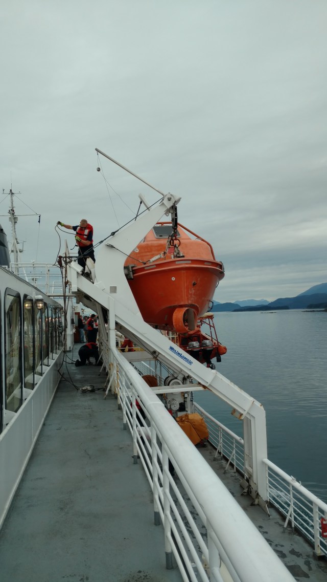 WTF! Couldn’t you have started with, “This is a drill”? The fact that a lifejacket wearing crew member then scurried by, did not fully comfort us. We thought that Mr. Murphy had pulled the ultimate F-U on us. Good thing we can swim, we thought, and hopefully fast enough to get to the small island off our starboard side, before we succumb to hypothermia or are eaten by an orca. Luckily it was only a drill, and we got to watch them practice launching the lifeboats.
