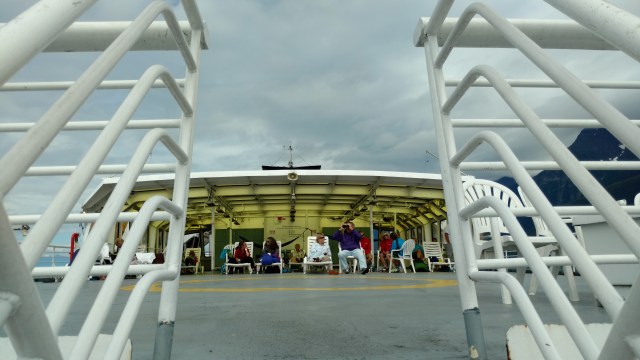 Our shuttle bus driver dropped us off at the Juneau ferry terminal, and after having consolidated our loose gear into one duffle, that Paul has now dubbed our “Schluffle”, we dumped that bad boy on the baggage cart and made our way to the Solarium at the stern of the Matanuska for an 8 hour voyage to Skagway, two hours of which would be spent in a stop at the Port of Haines.