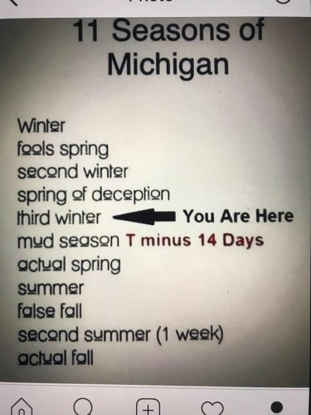 We apparently were in what my aunt calls, “Third Winter”, of the “eleven seasons” of Michigan.