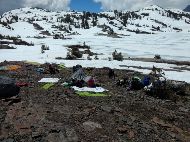 Well last night was far from warm and dry. No sooner than we ducked into our tents, a steady patter of rain began to fall that lasted most of the night. By morning light it had stopped, and a good portion of the snow that originally surrounded us had retreated. We put on our still damp clothes, slipped into our cold wet shoes, packed up our wet tents, had a hot coffee and breakfast and we were on our way…uphill of course.