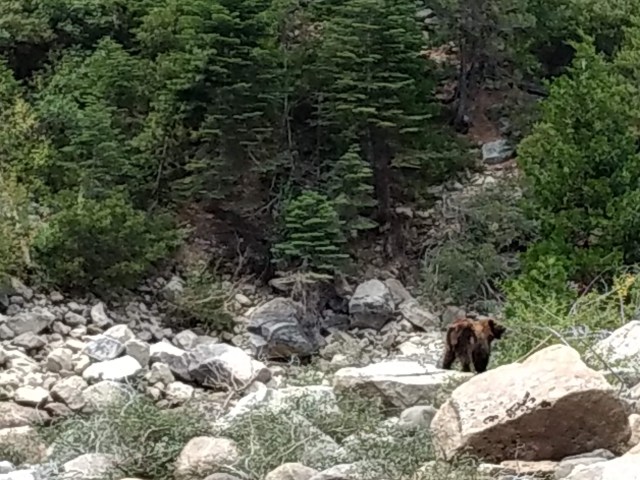 With another morning start once again near 9 am, it wasn’t till around noon that we stopped at an inviting swimming hole for lunch. Just as we are about to explore our swimming hole, Paul spies a bear heading to the water, initially in our direction. Paul greets him with, “Hey Bear!”, and the good sized rusty brown colored bear looks up, sniffs and continues in the other direction down river.