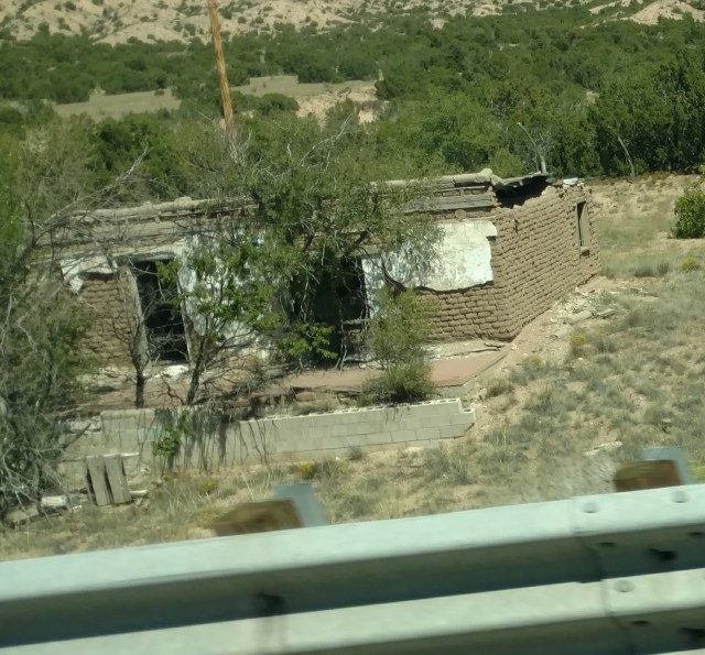 As we travel the I-25 from Las Cruces toward Santa Fe, small towns preceeded by ancient Adobe structures in various degrees of decay can be seen along the highway.